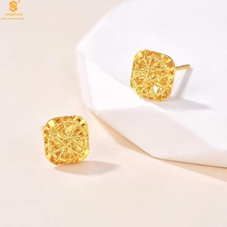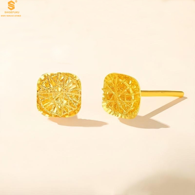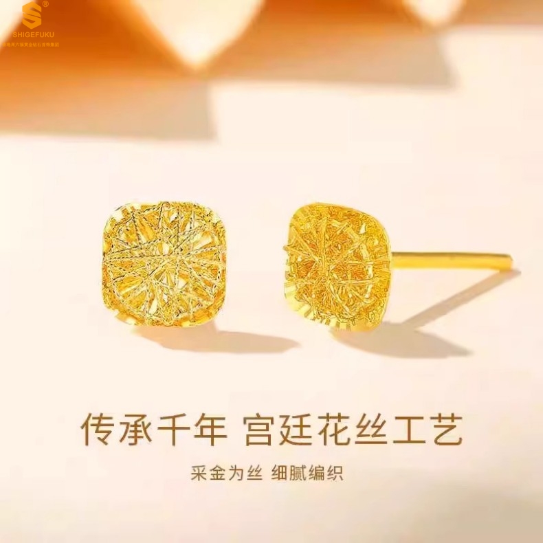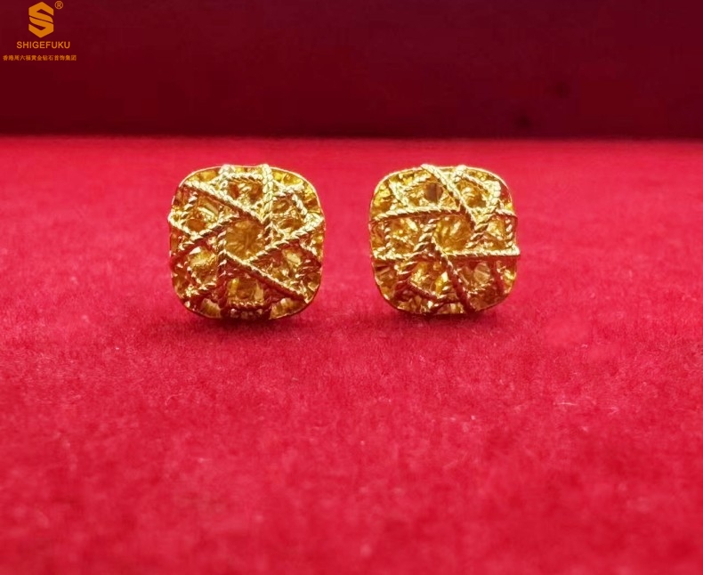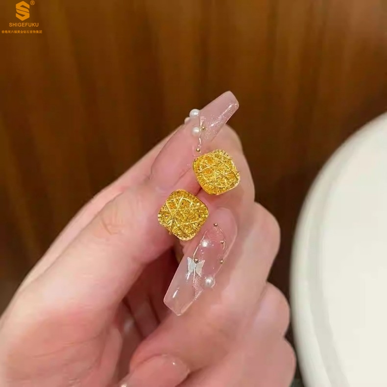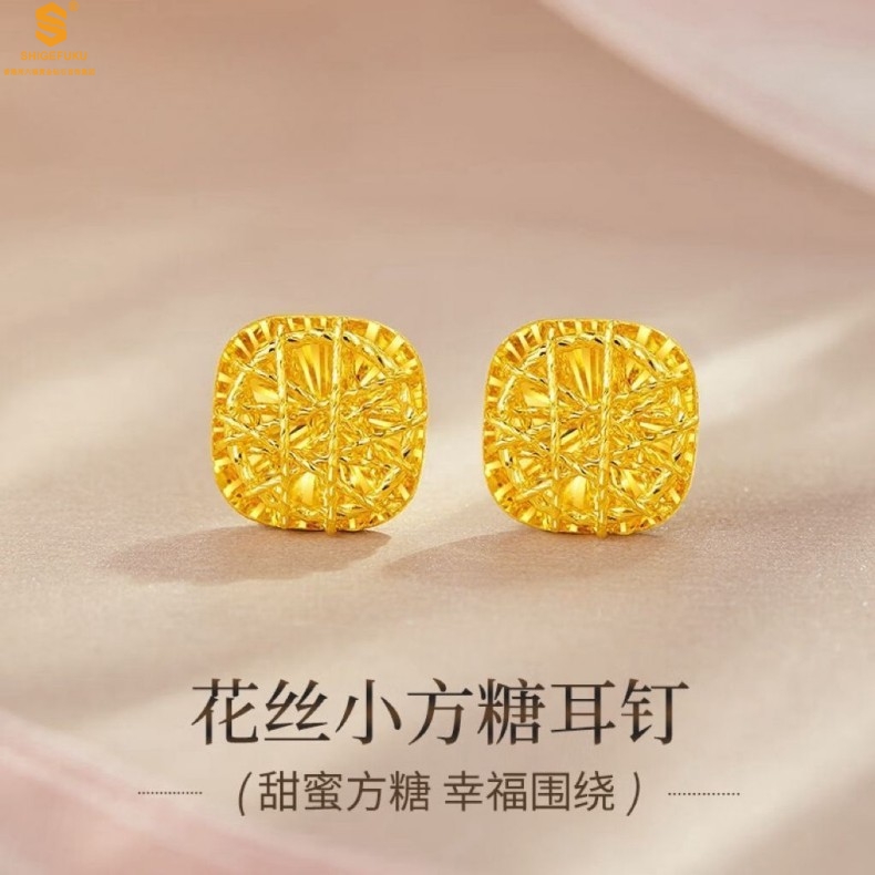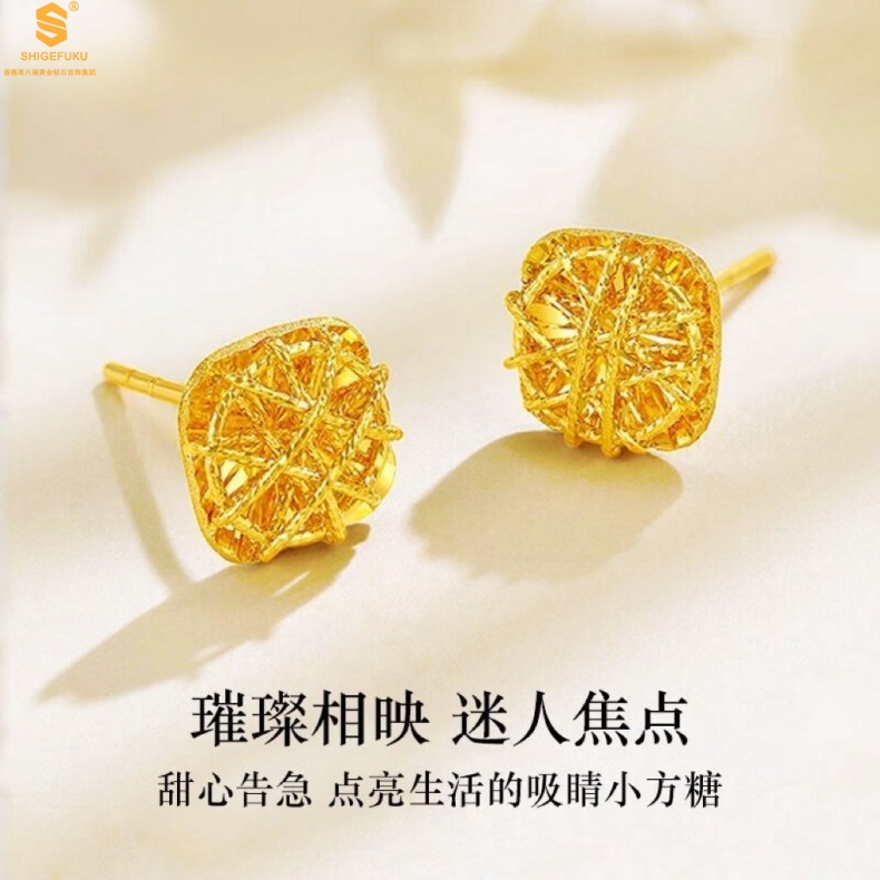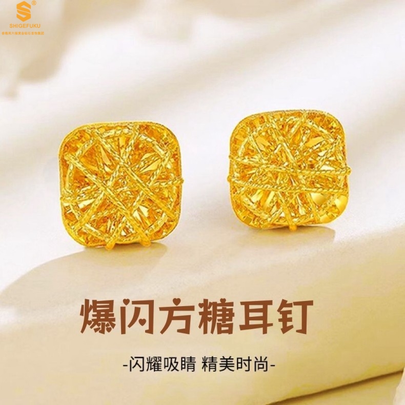 【品名】精雕镂空花丝幸福甜蜜小方糖足金内嵌足银耳钉(对)