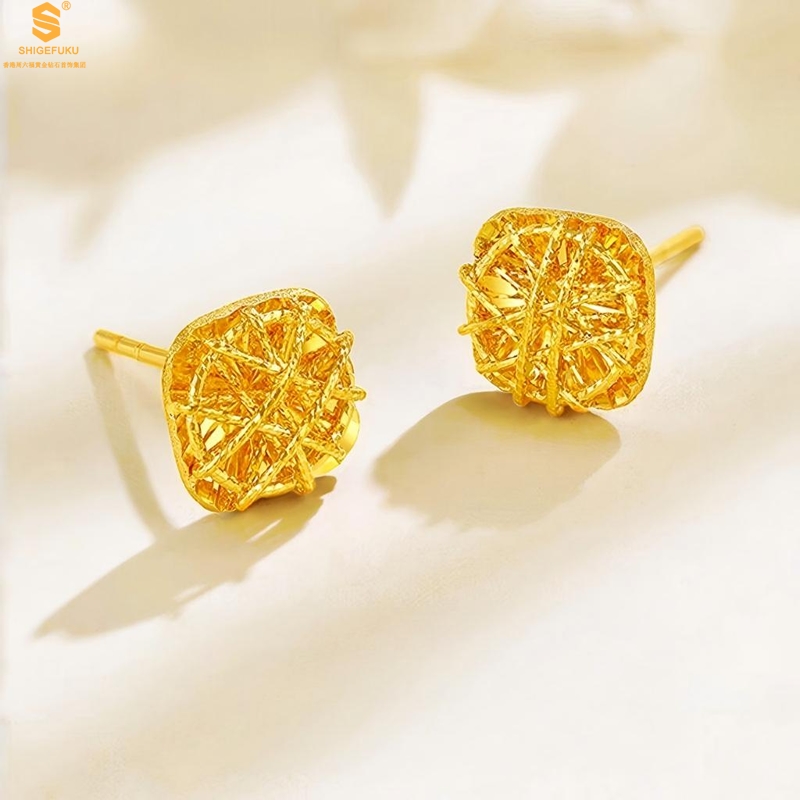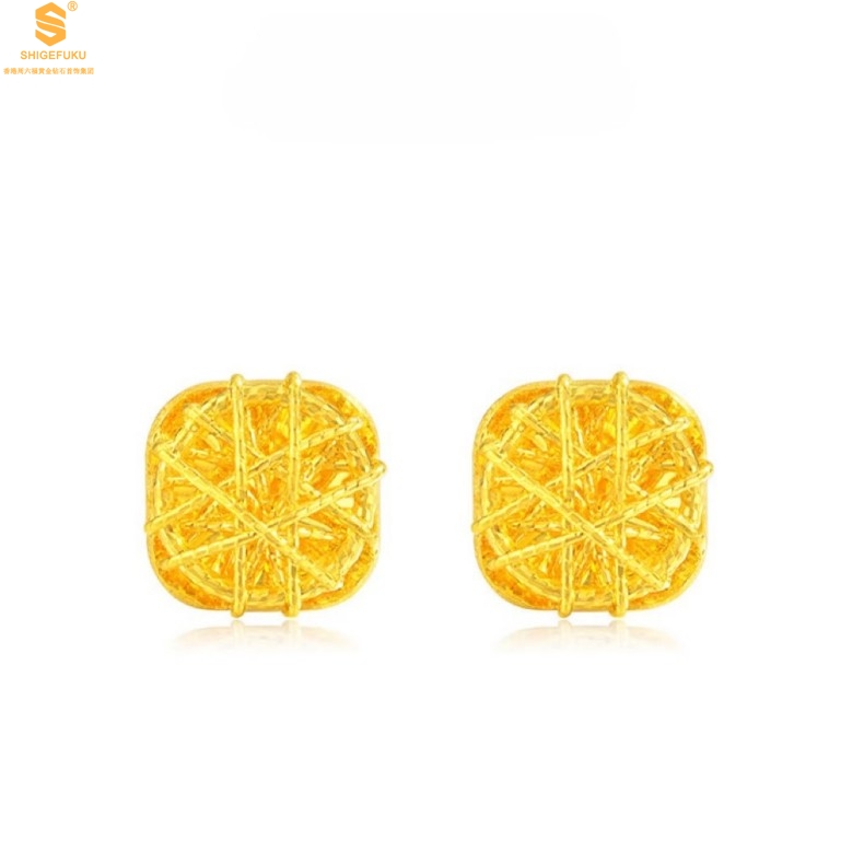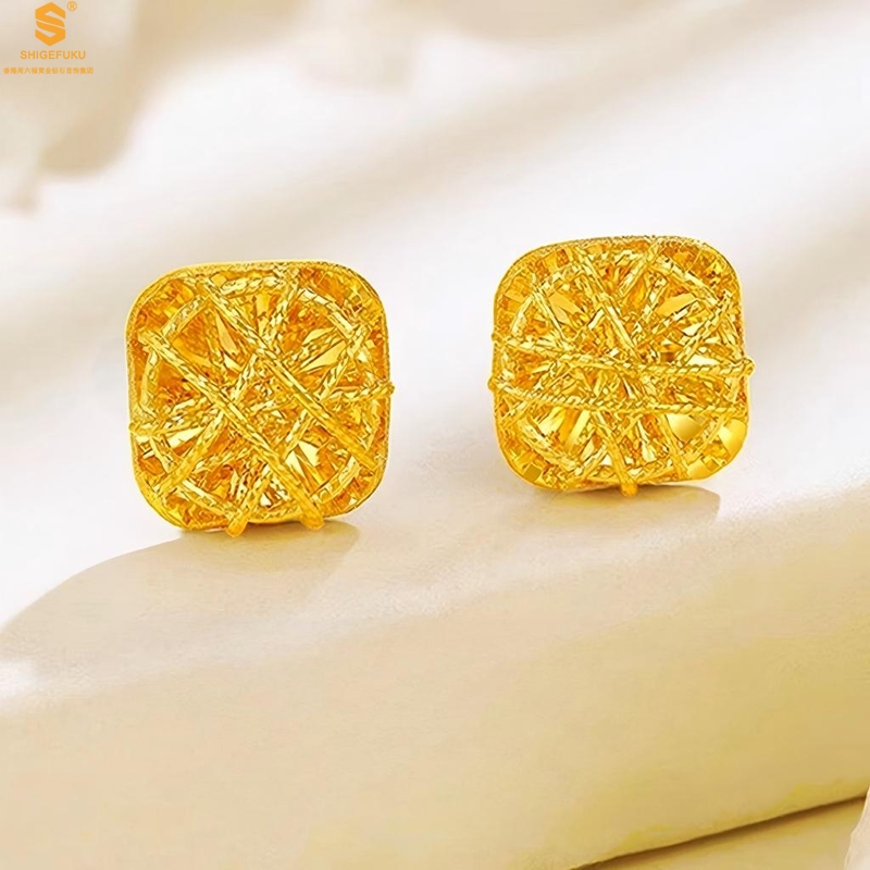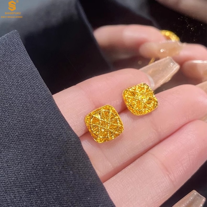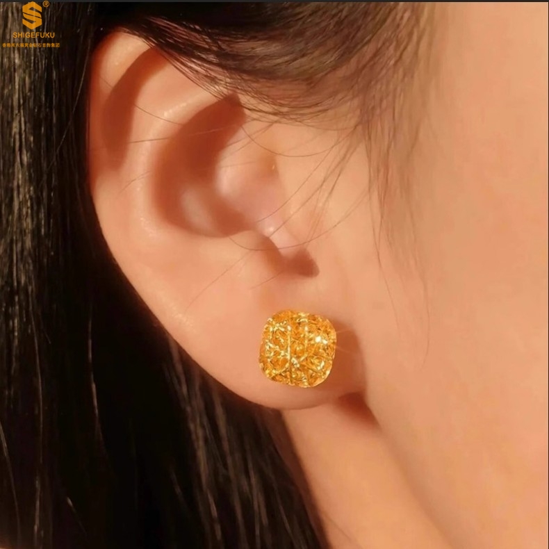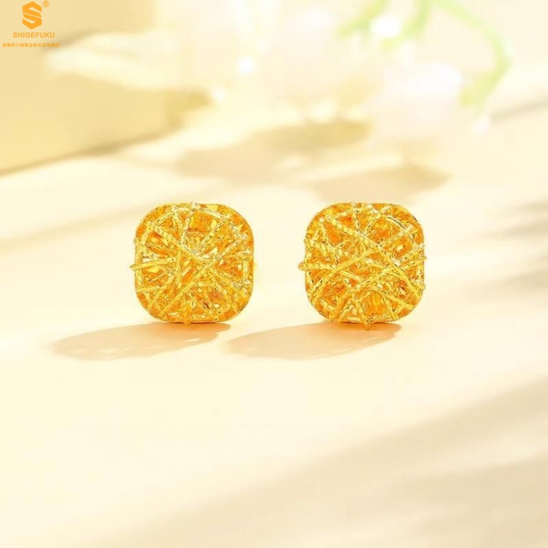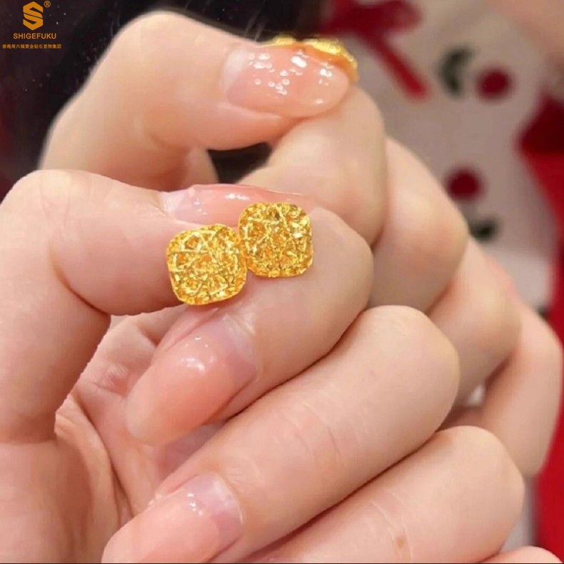 【品名】精雕镂空花丝幸福甜蜜小方糖足金内嵌足银耳钉(对)