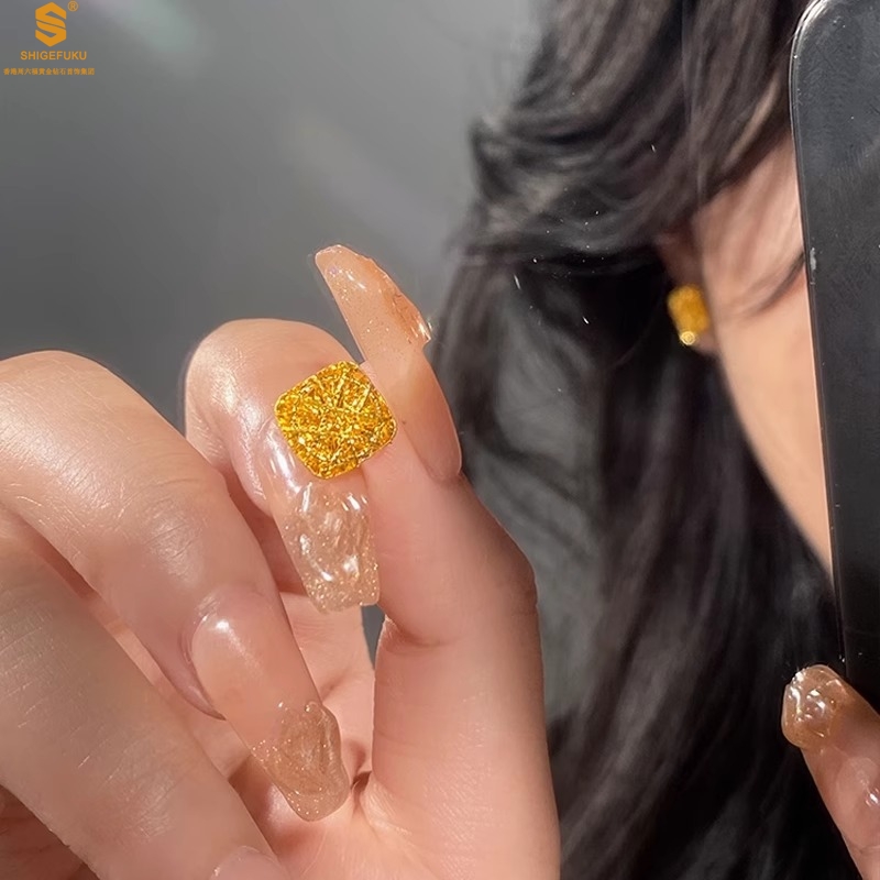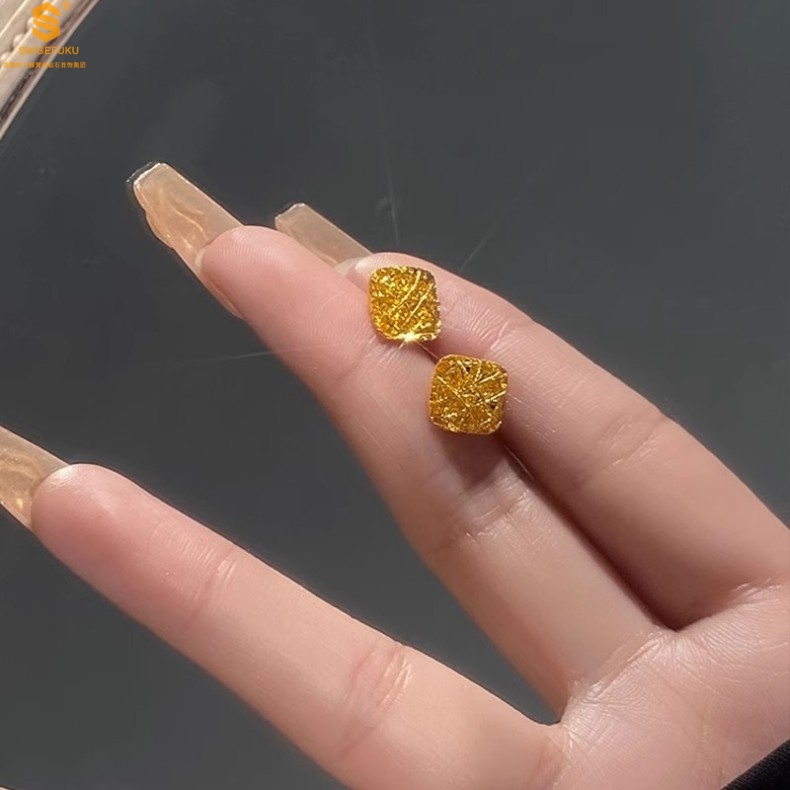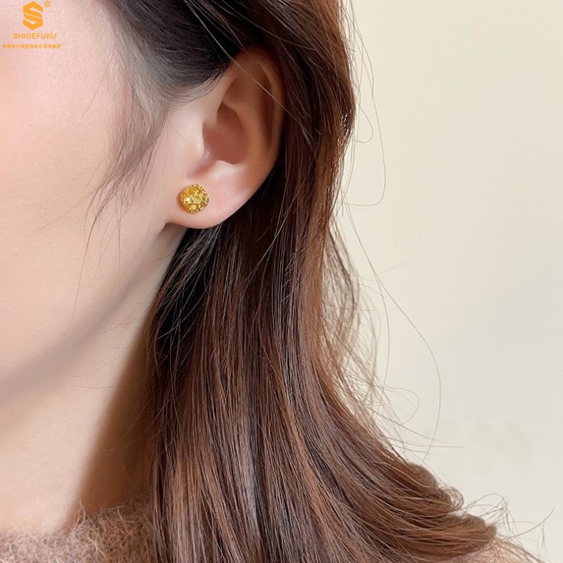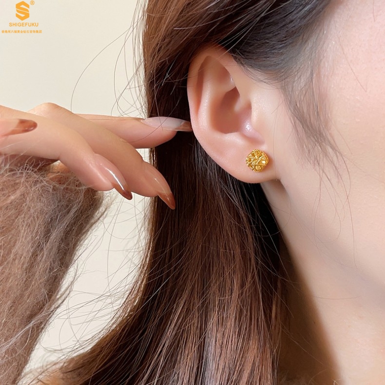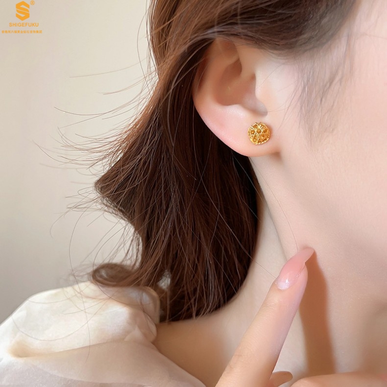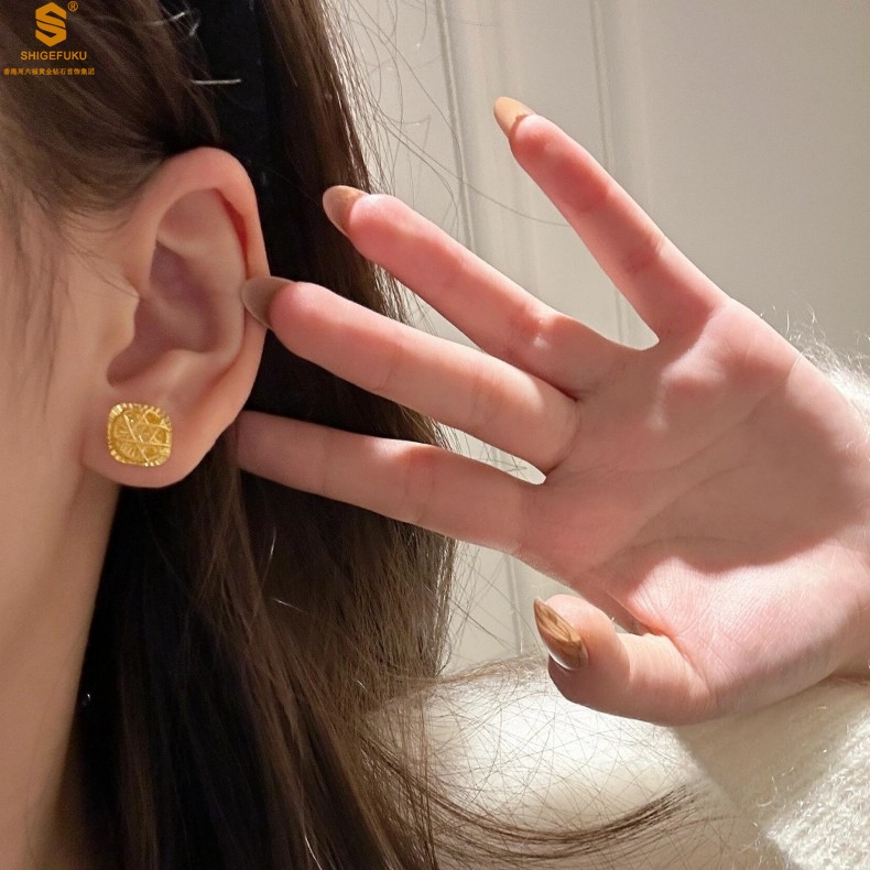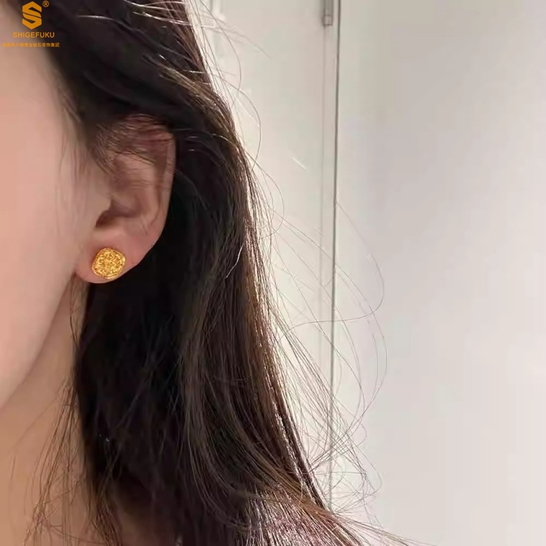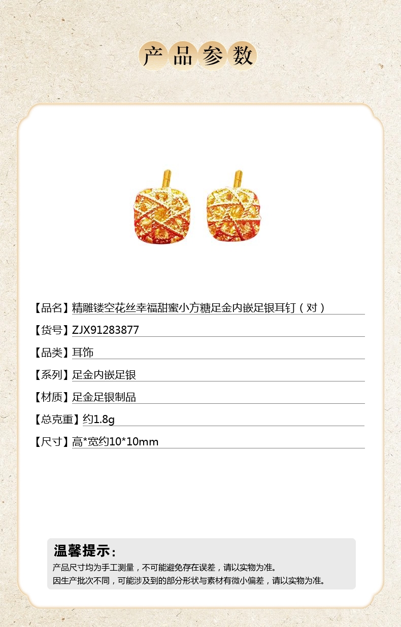 【品名】精雕镂空花丝幸福甜蜜小方糖足金内嵌足银耳钉(对)