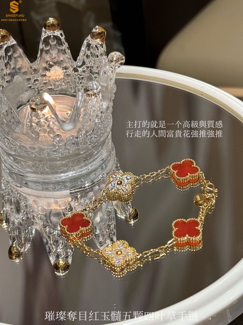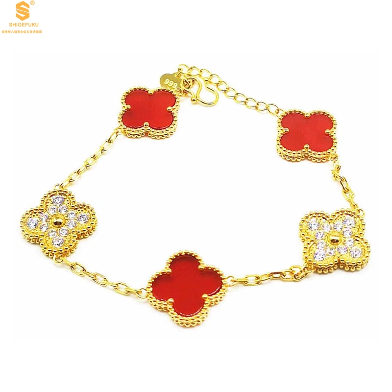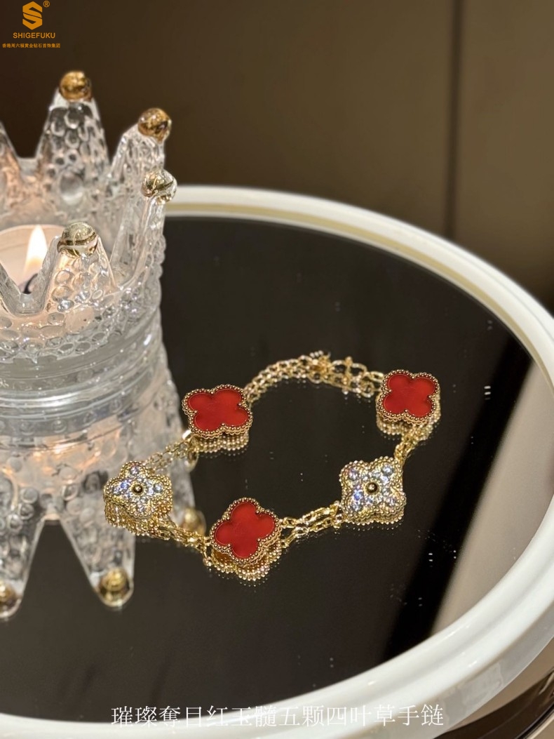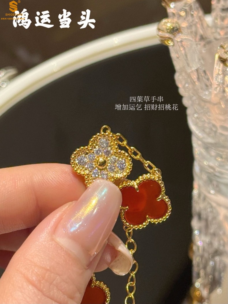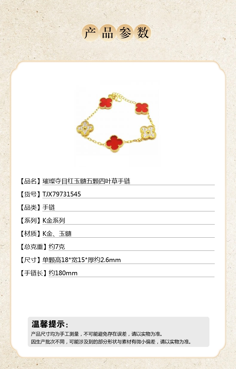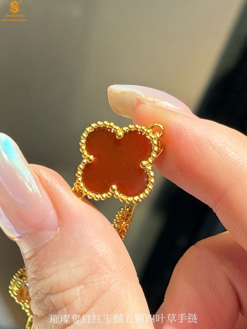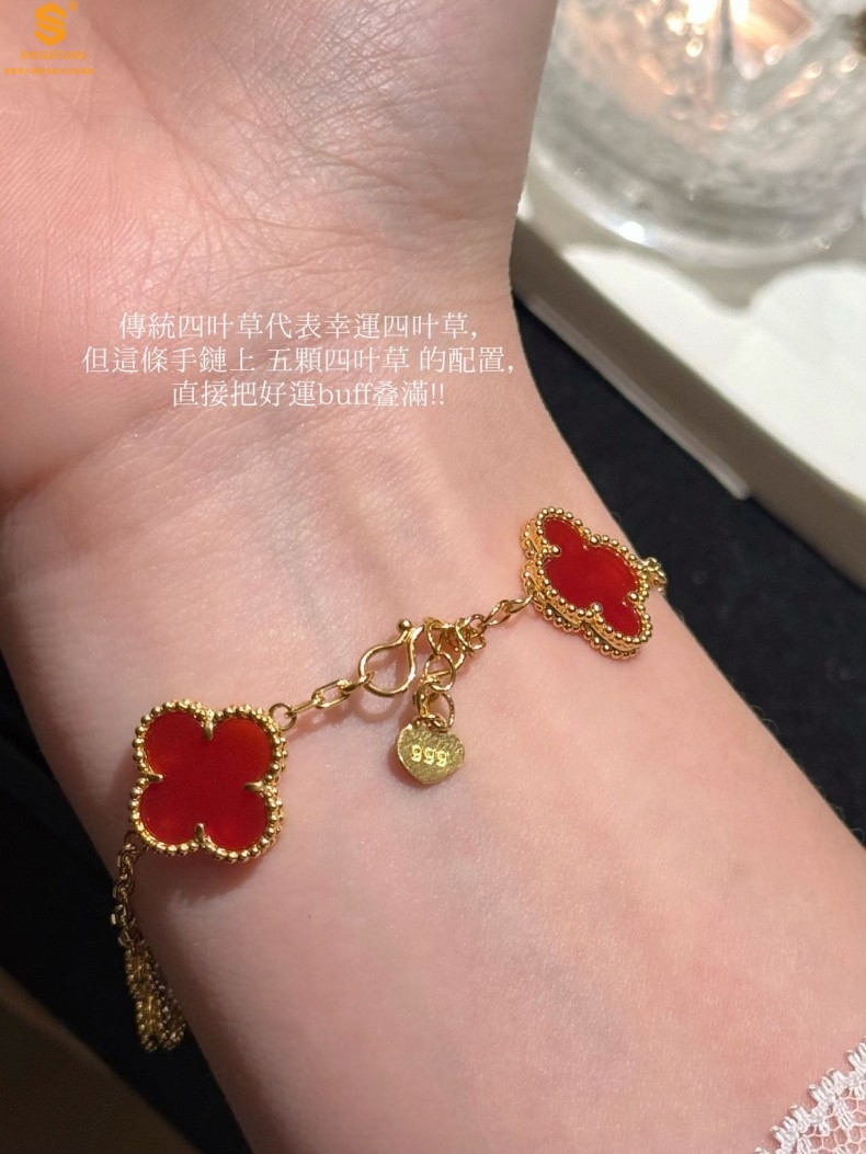【品名】璀璨夺目红玉髓五颗四叶草手链