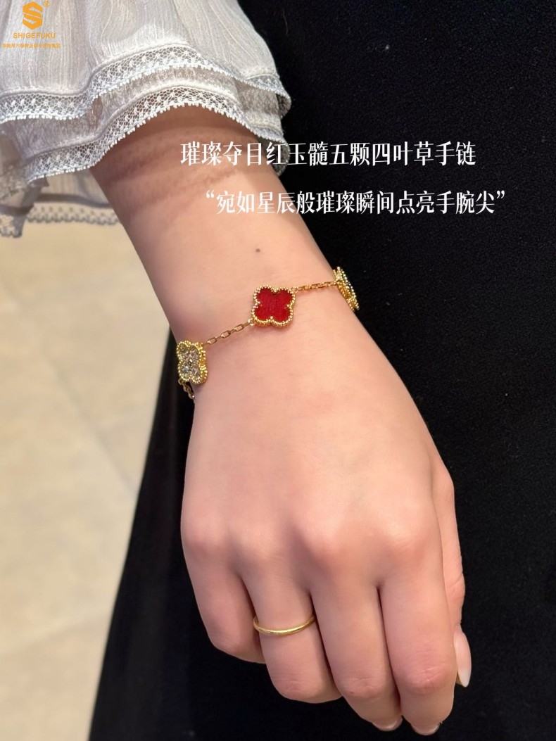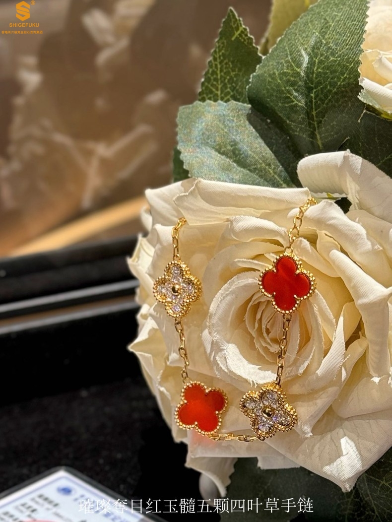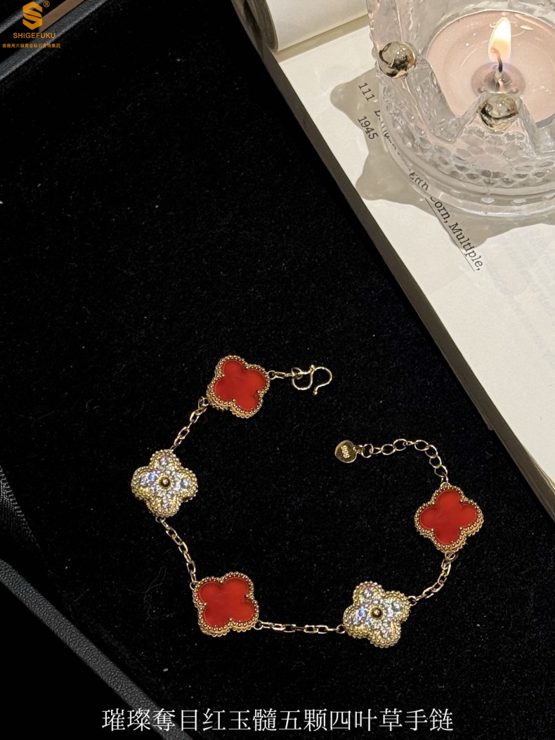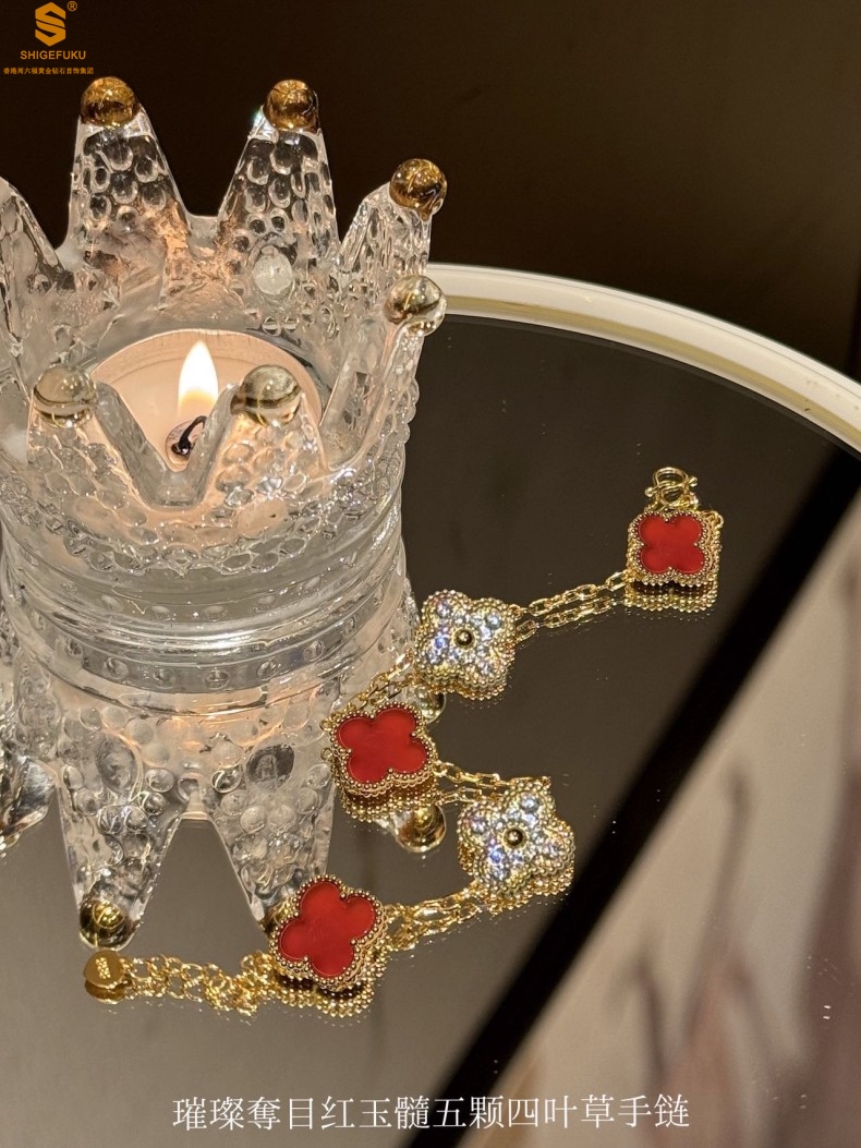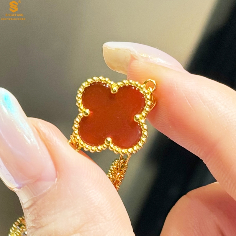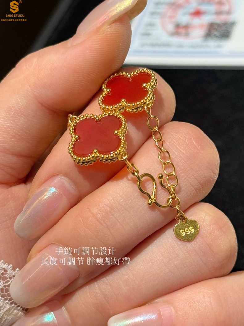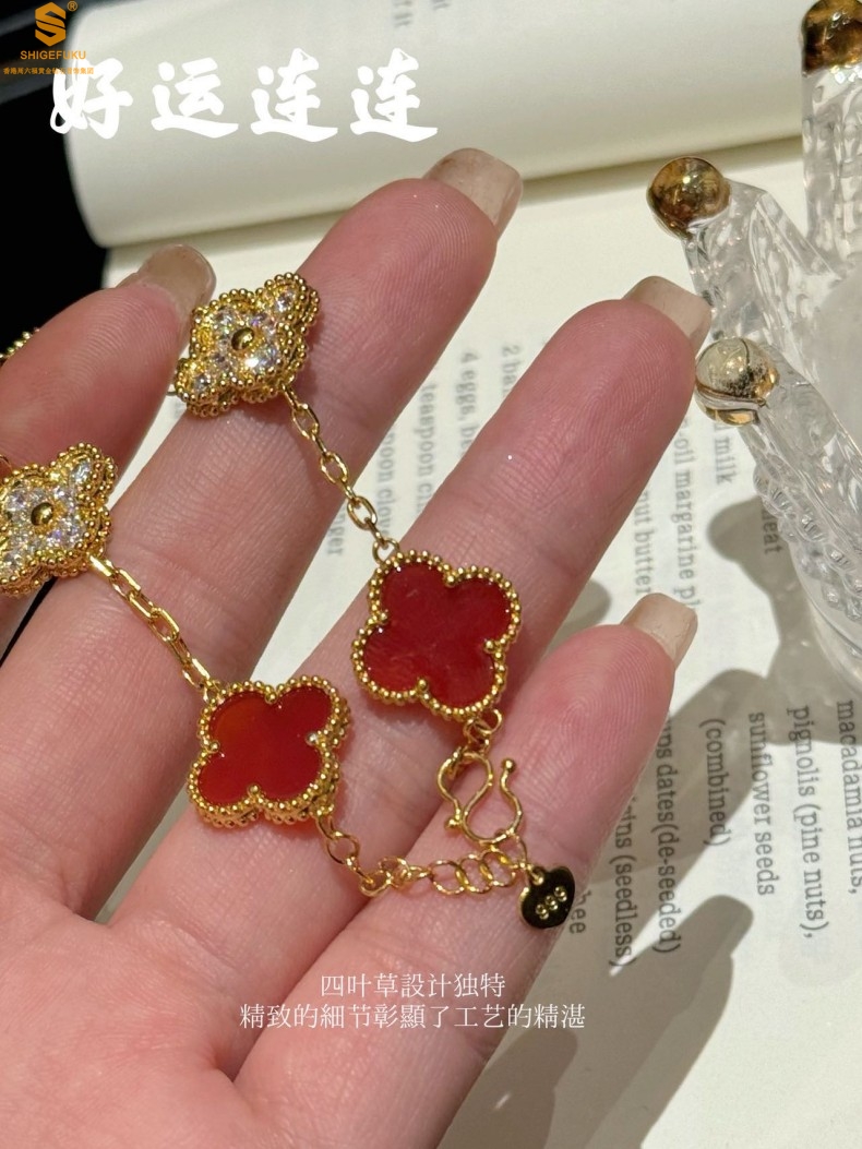 【品名】璀璨夺目红玉髓五颗四叶草手链