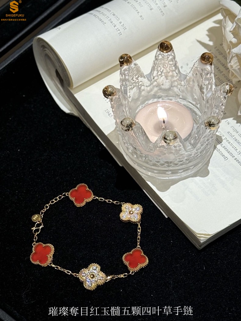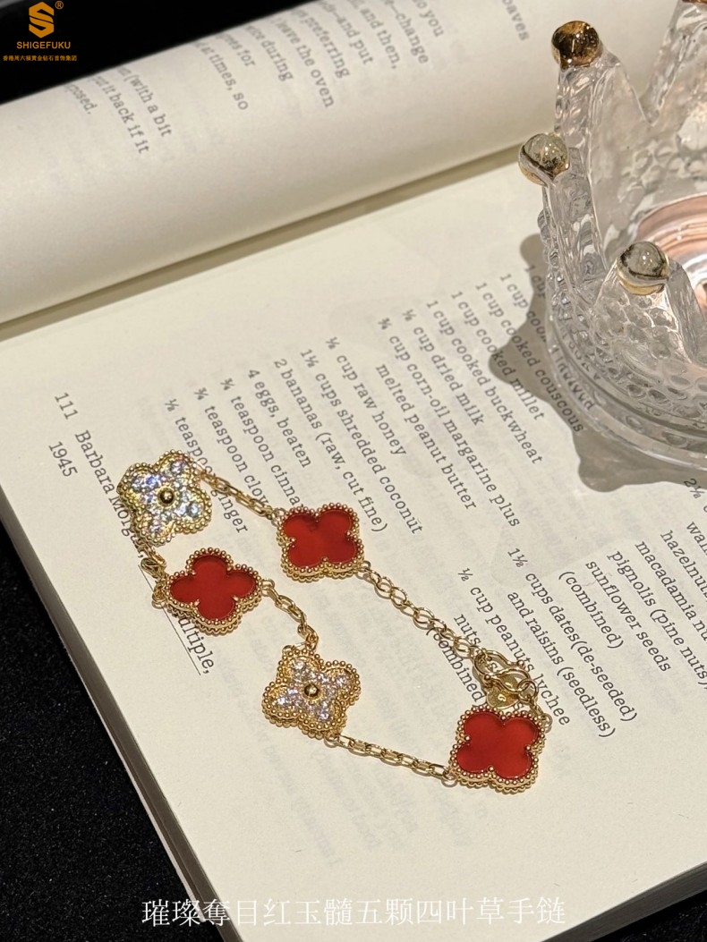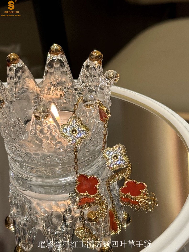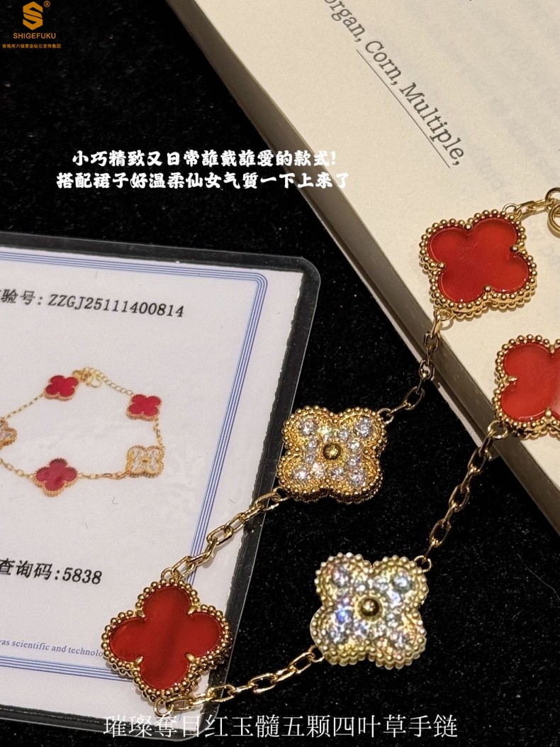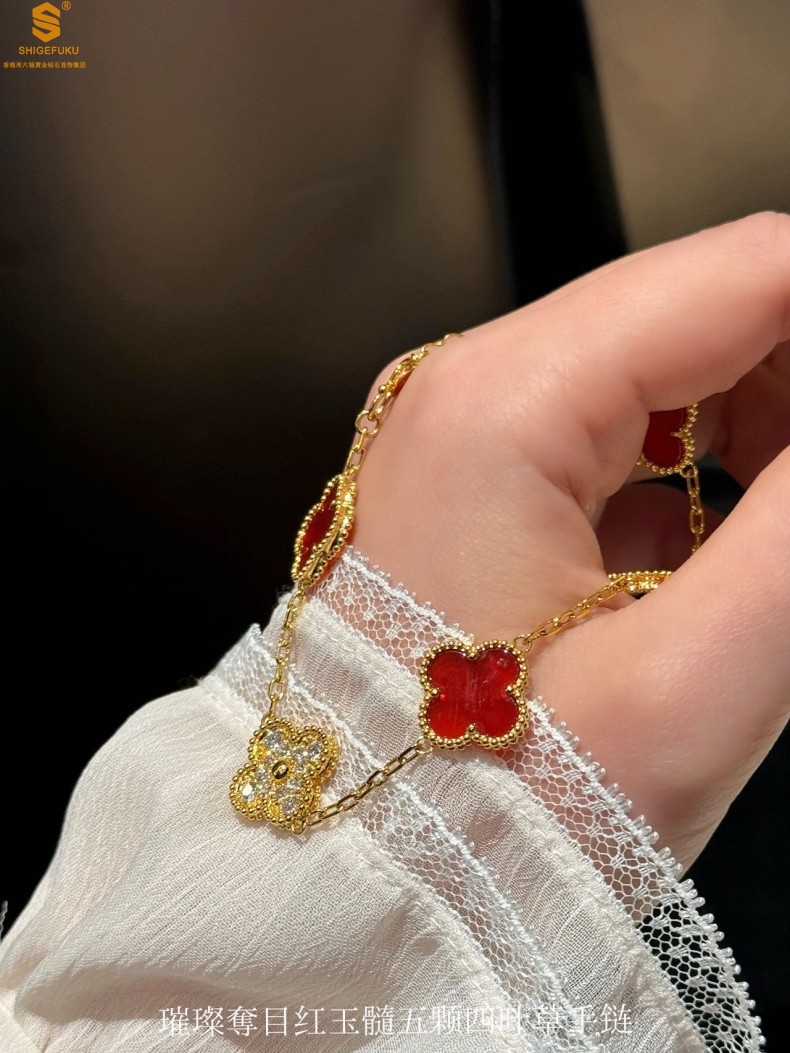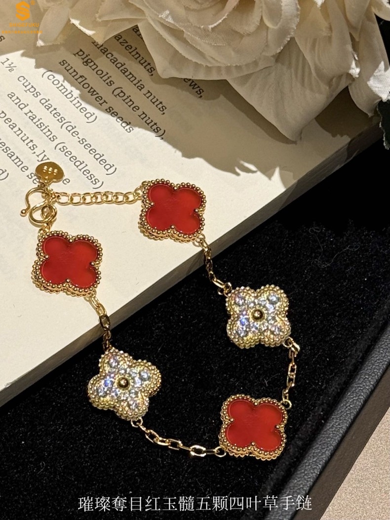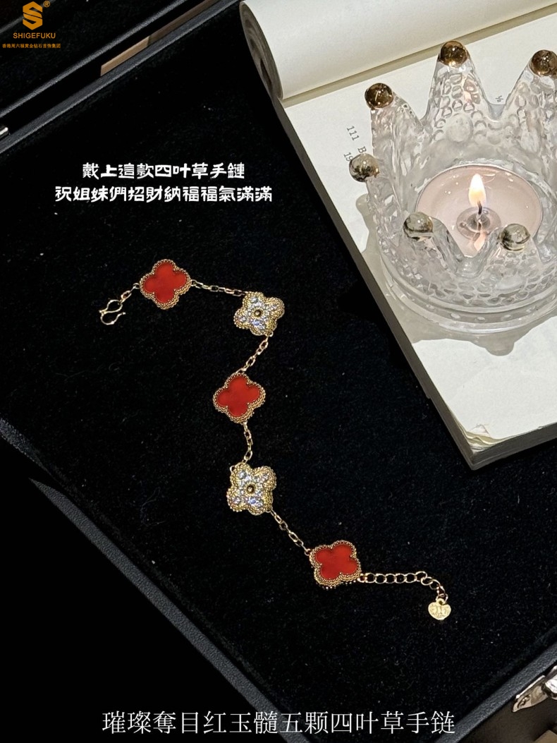 【品名】璀璨夺目红玉髓五颗四叶草手链