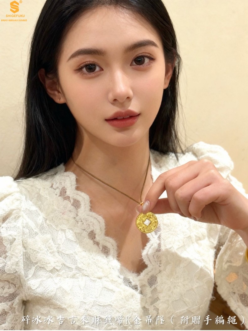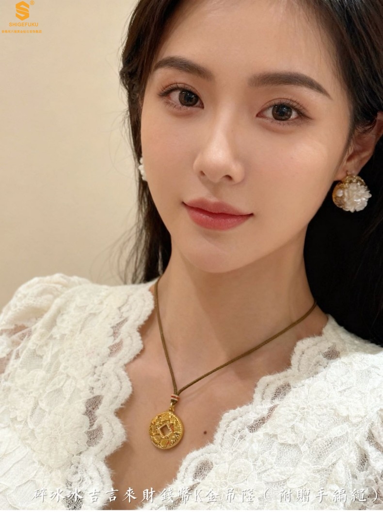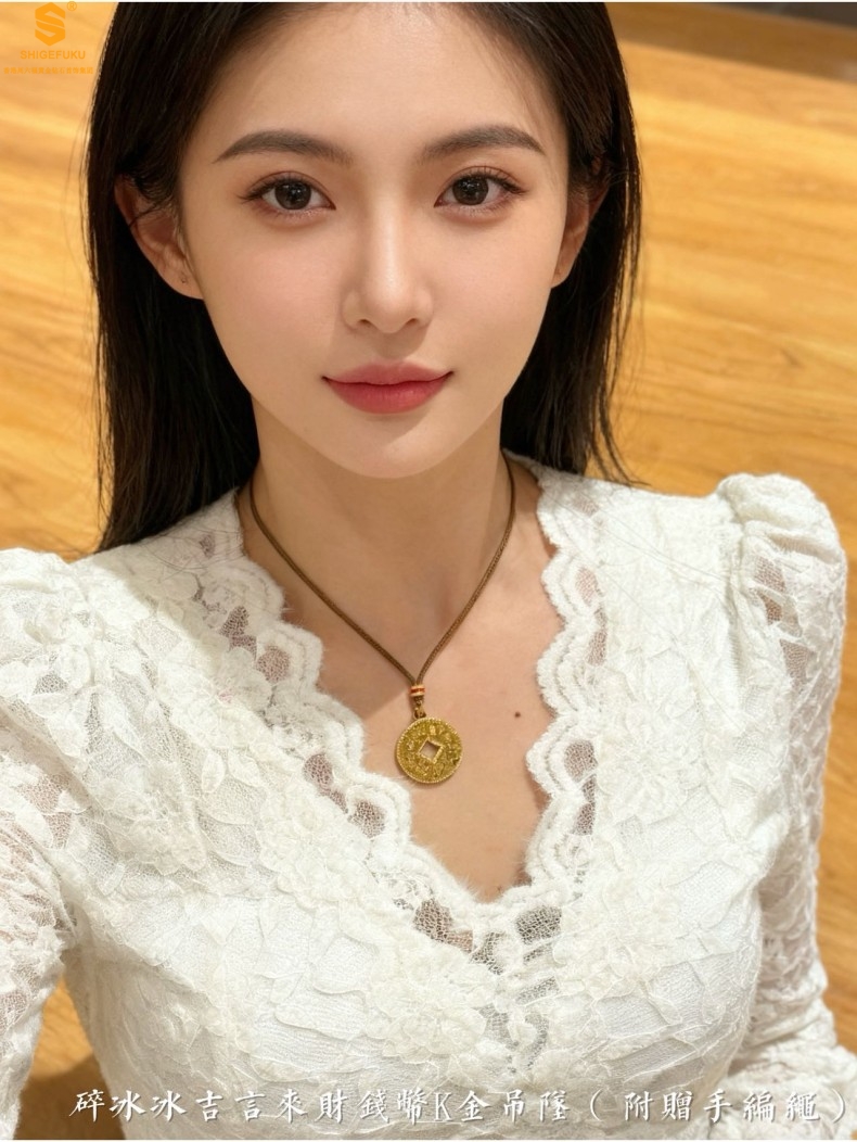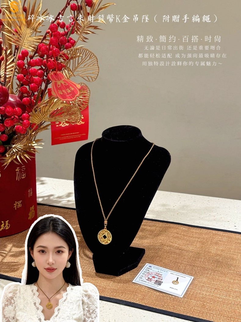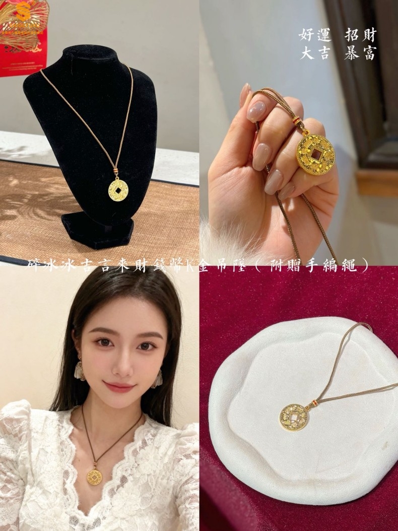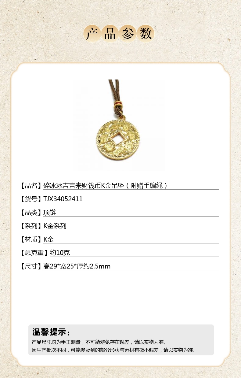 【品名】碎冰冰吉言来财钱币K金吊坠(附赠手编绳)