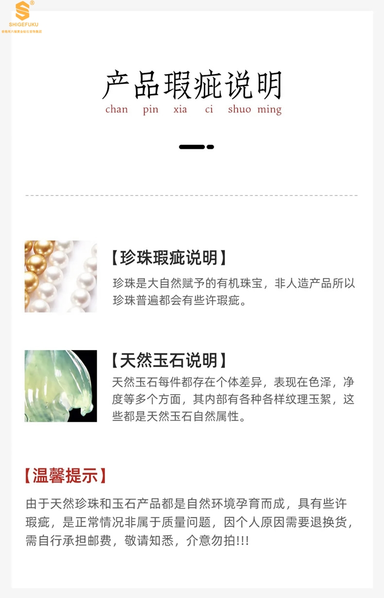 6、售后寄回物品,必须保证:首饰+礼品盒+礼品袋(如有)+国检证书+质保单+保养卡均寄回,丢失部分我们将按照售价扣除。