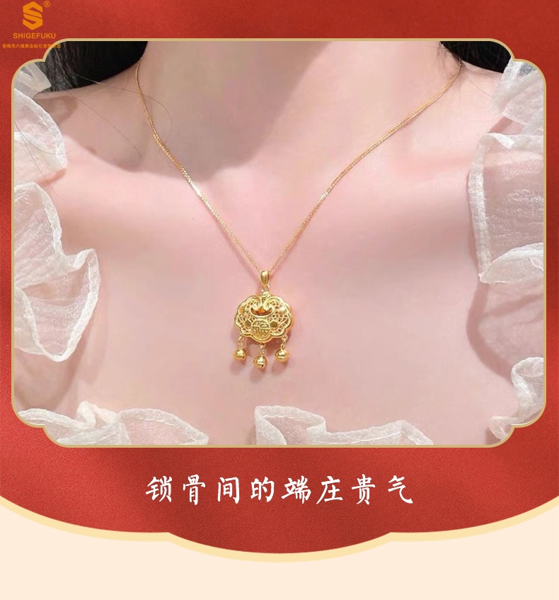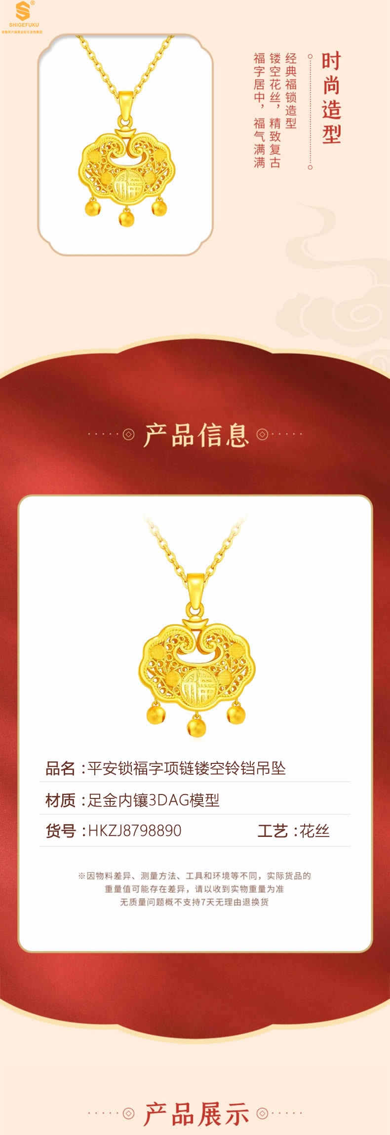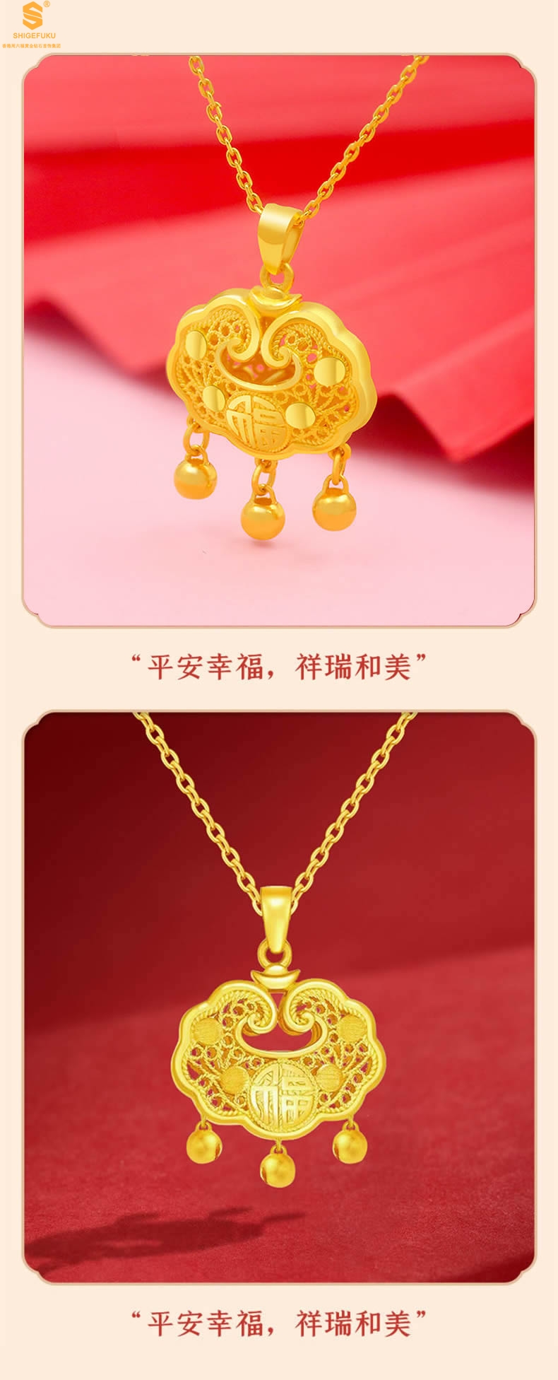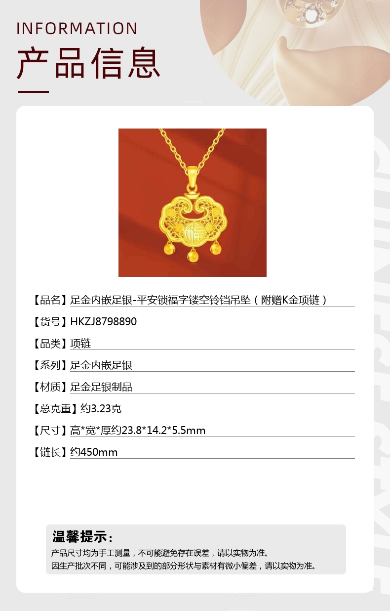 【品名】足金内嵌足银-平安锁福字镂空铃铛吊坠(附赠K金项链)