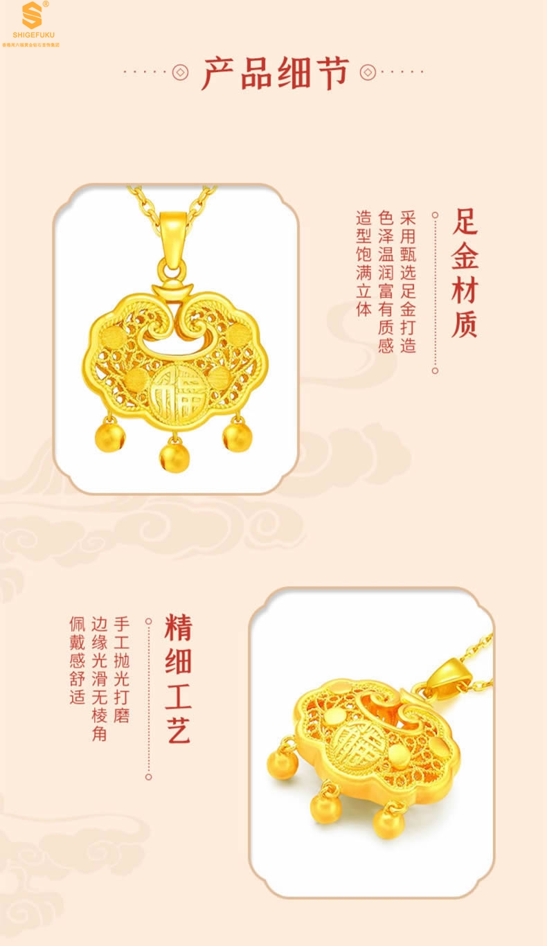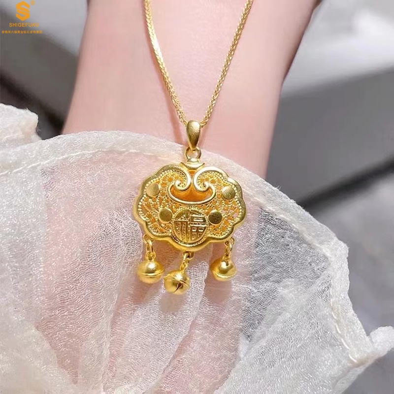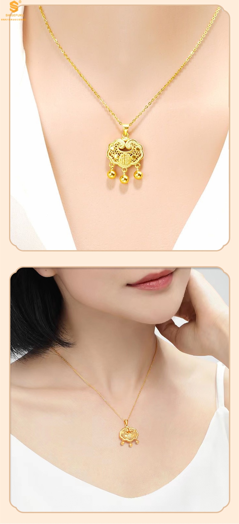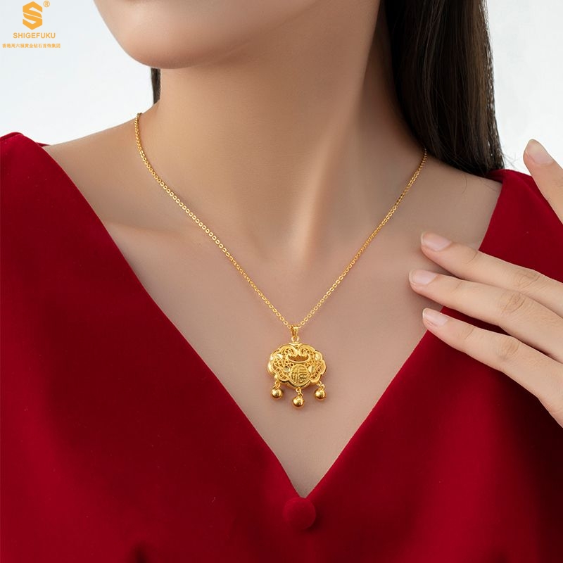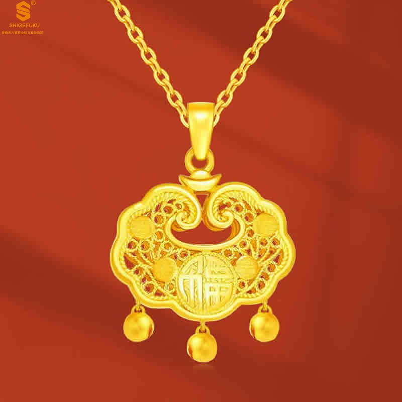 【品名】足金内嵌足银-平安锁福字镂空铃铛吊坠(附赠K金项链)