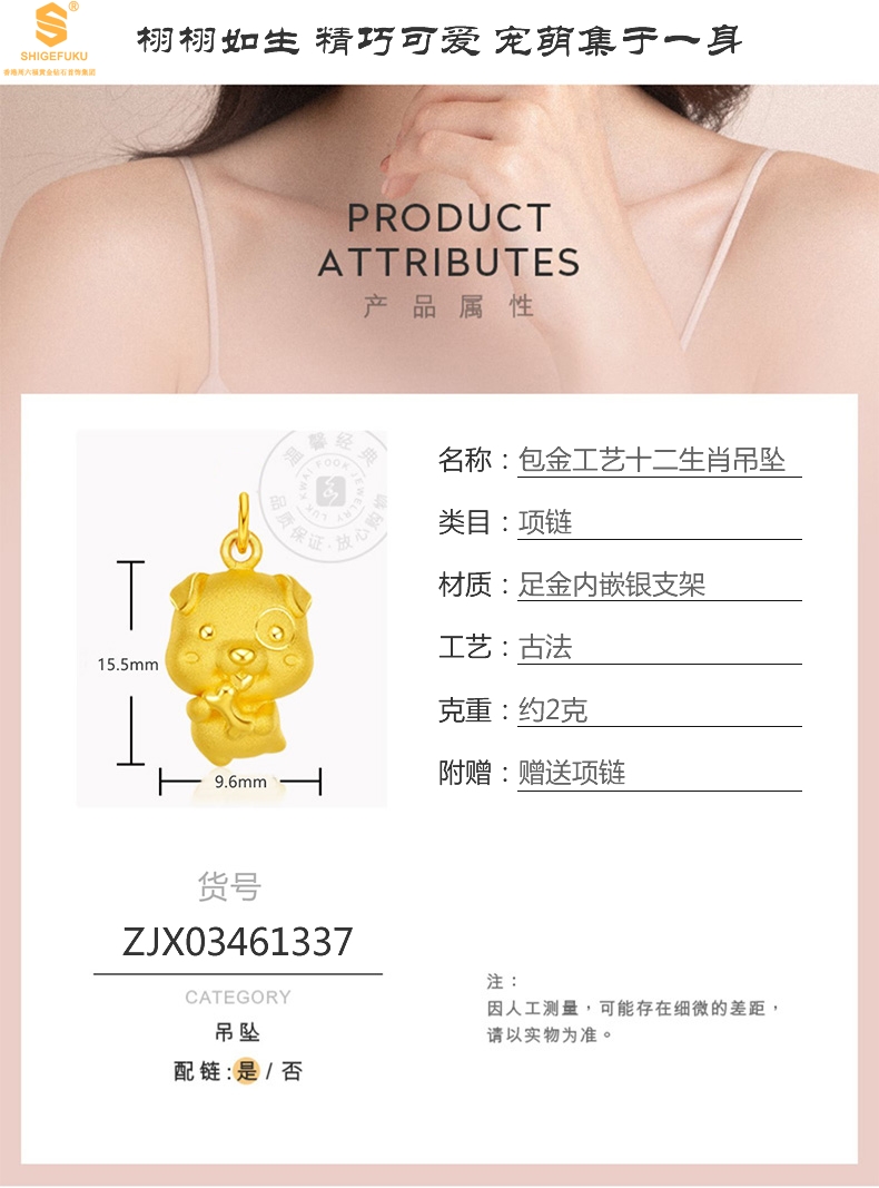 【品名】足金内嵌足银十二生肖吊坠(附赠K金项链)