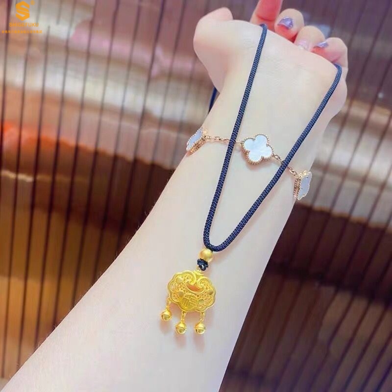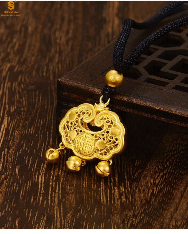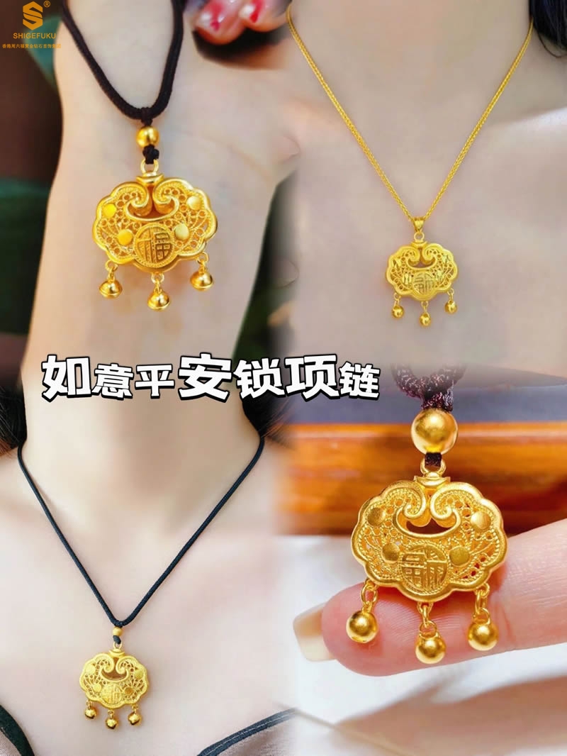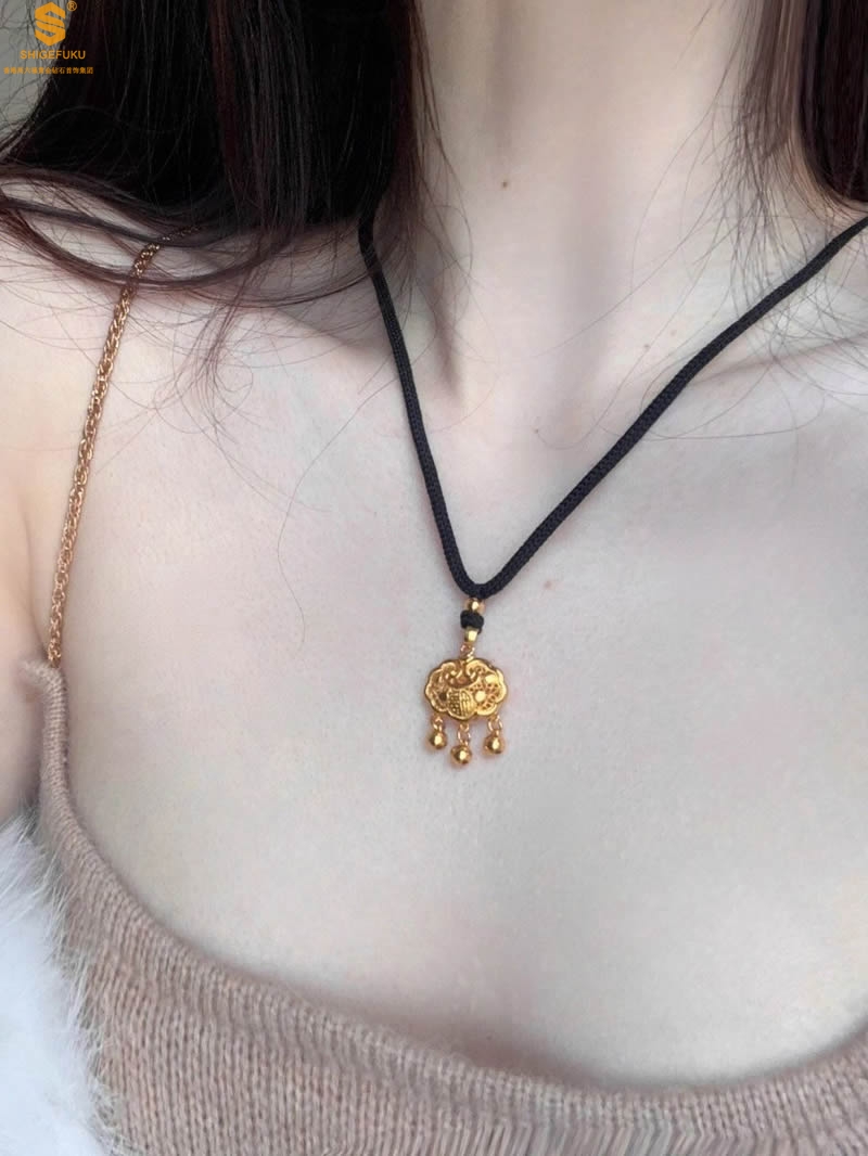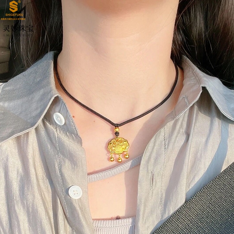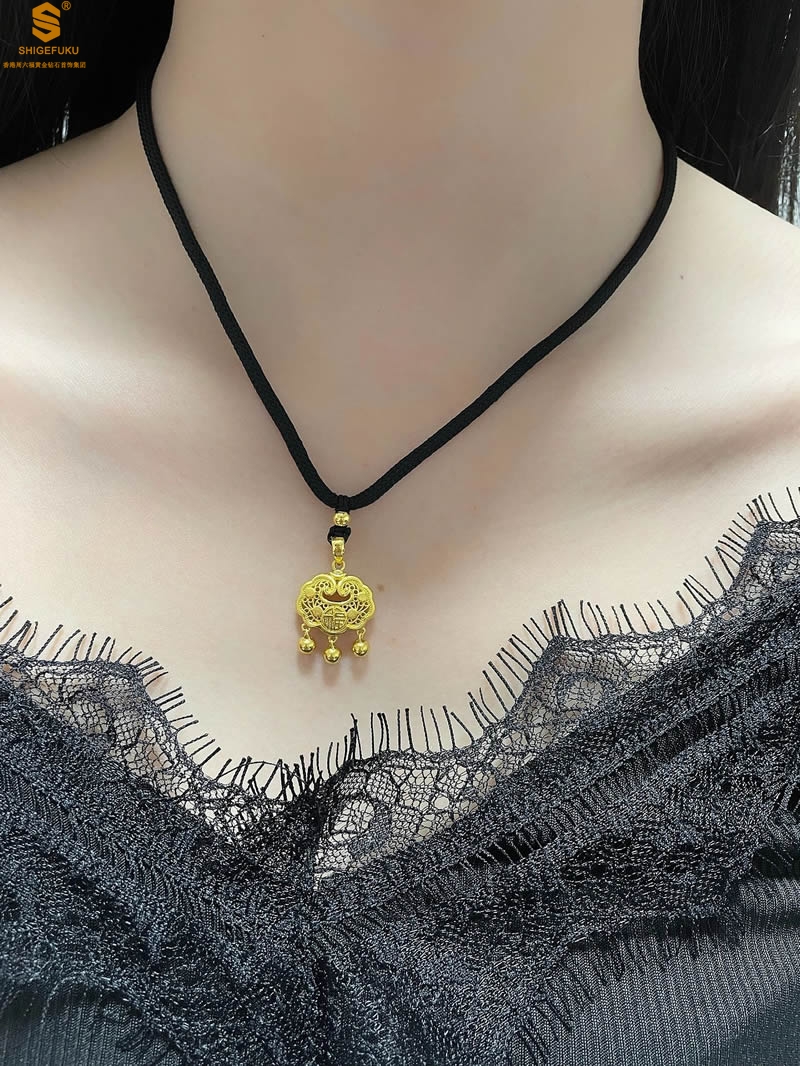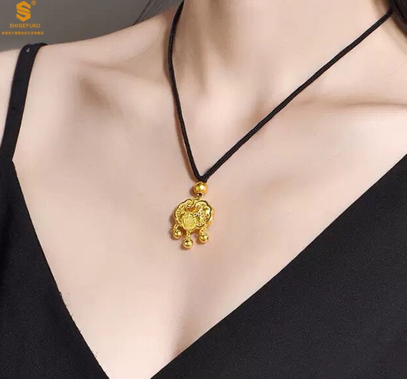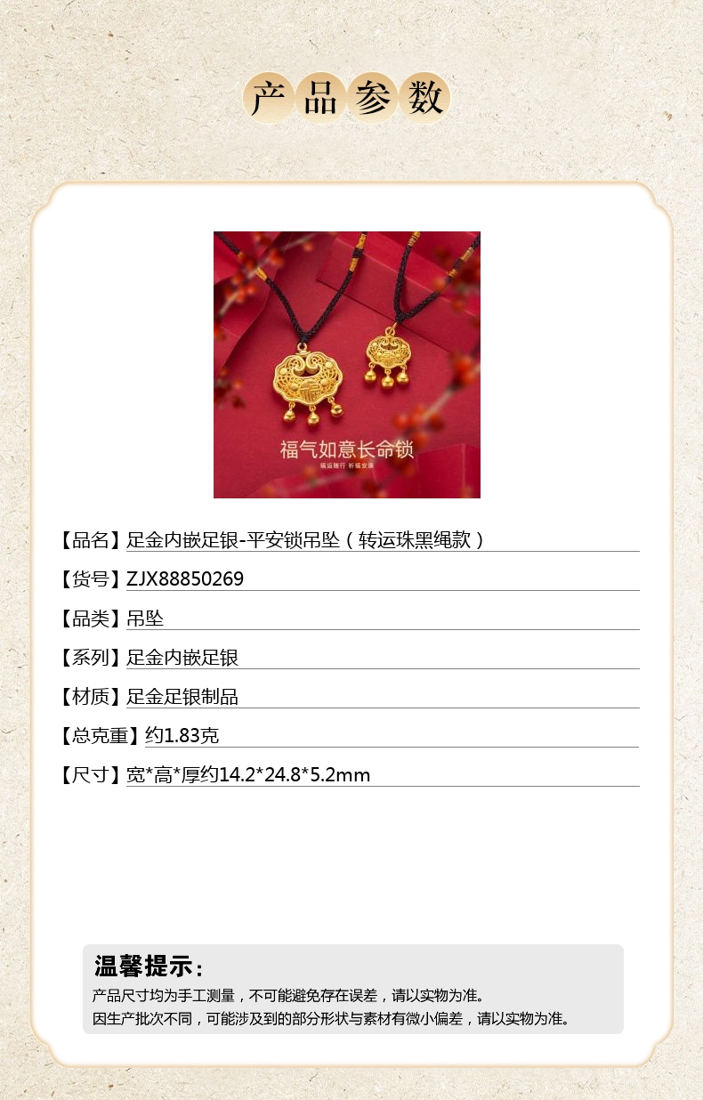 【品名】足金内嵌足银-平安锁吊坠(转运珠黑绳款)