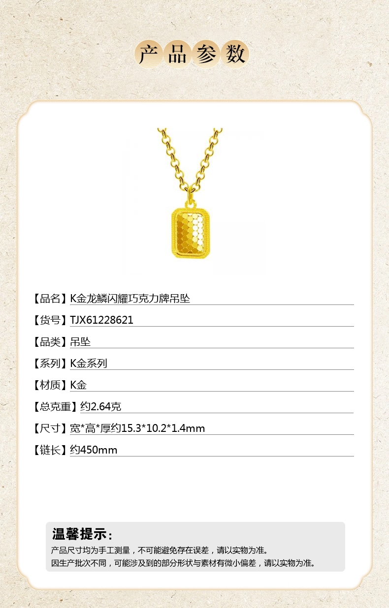 【品名】K金龙鳞闪耀巧克力牌吊坠