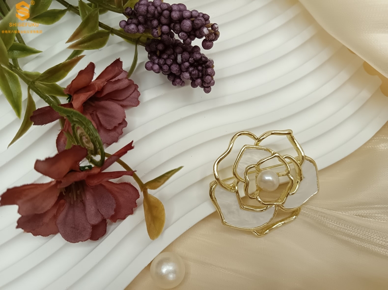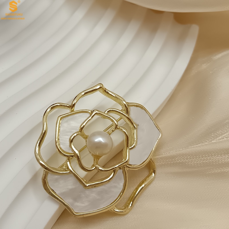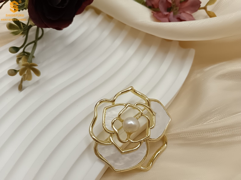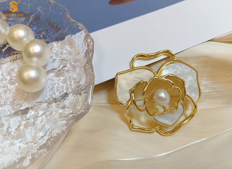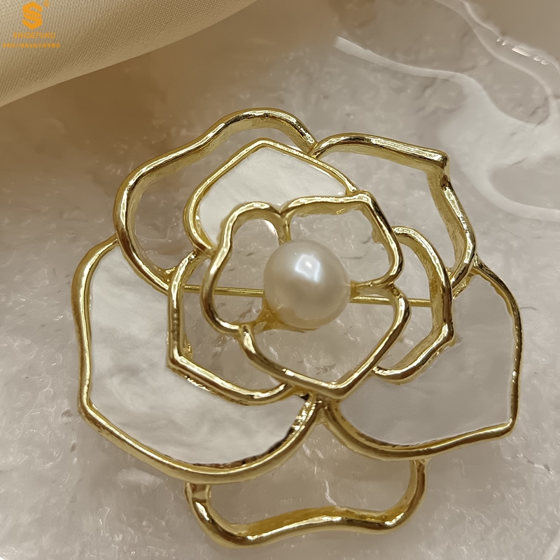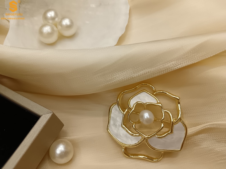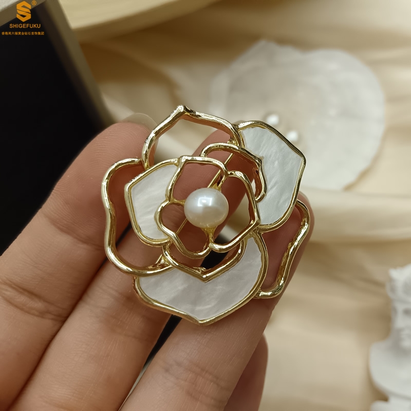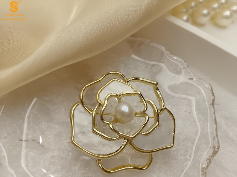 【品名】天然珍珠白贝山茶花胸针