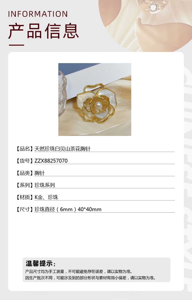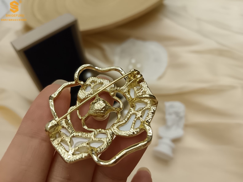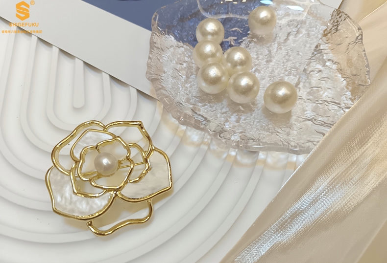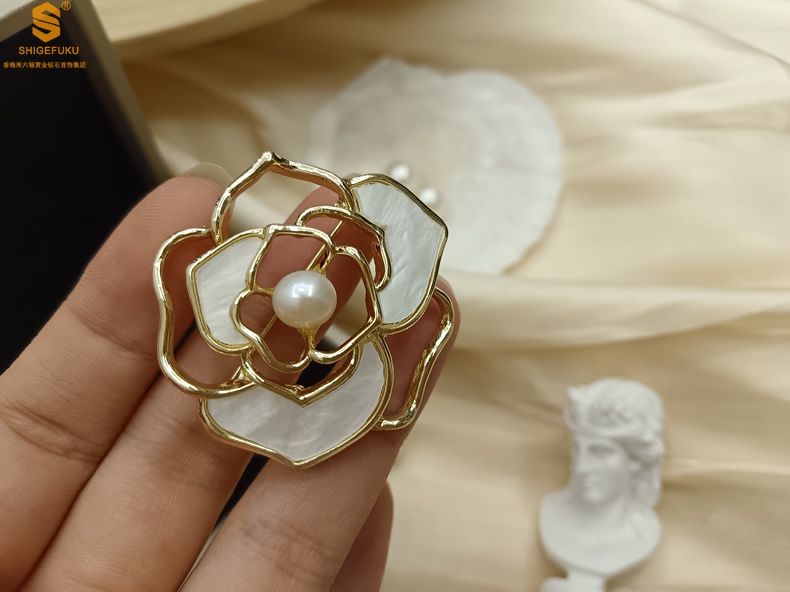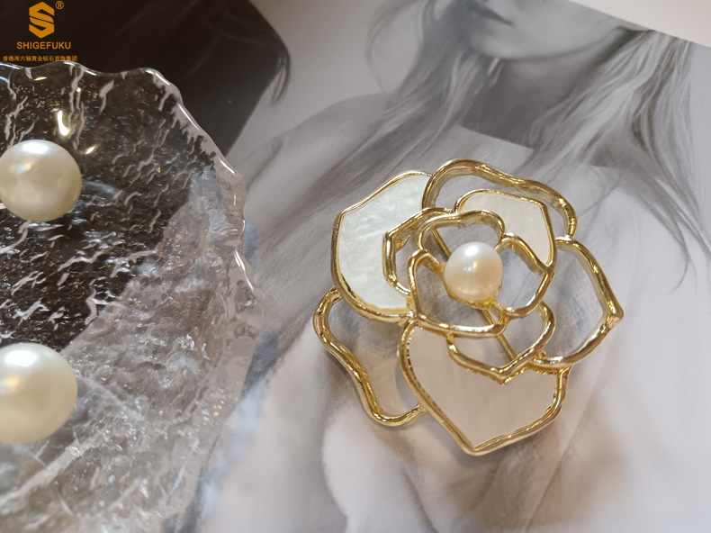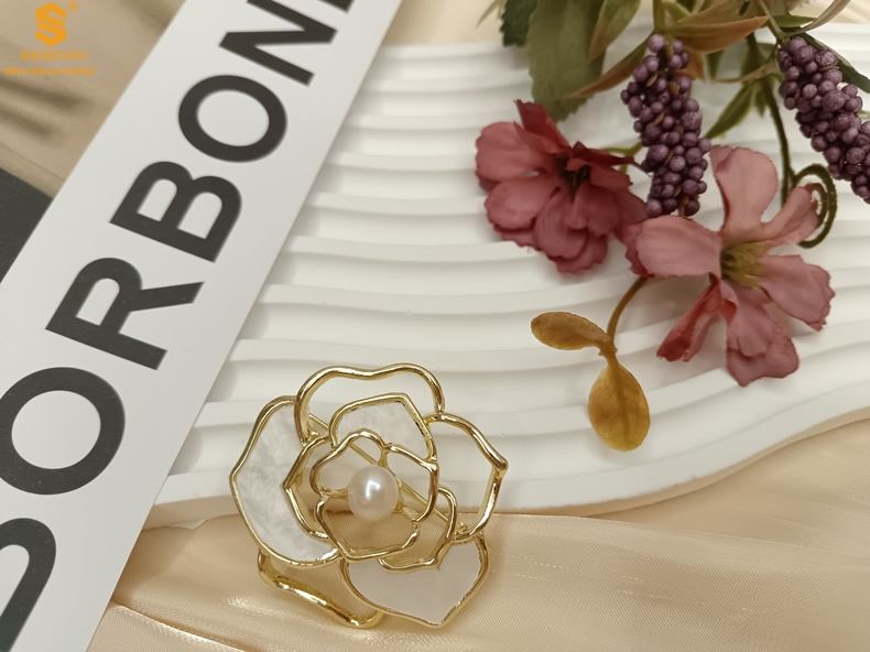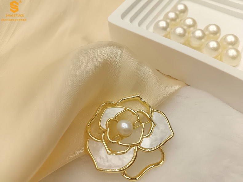 【品名】天然珍珠白贝山茶花胸针