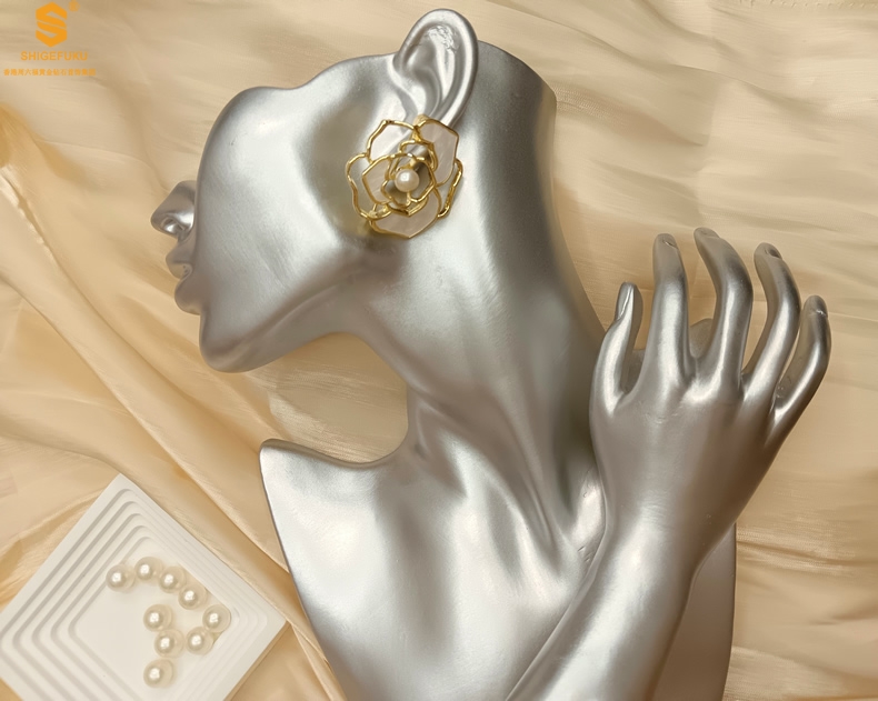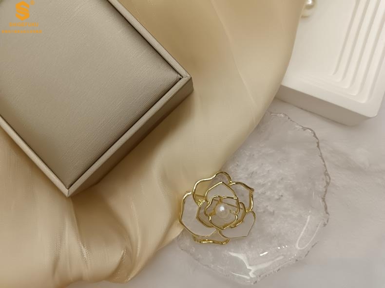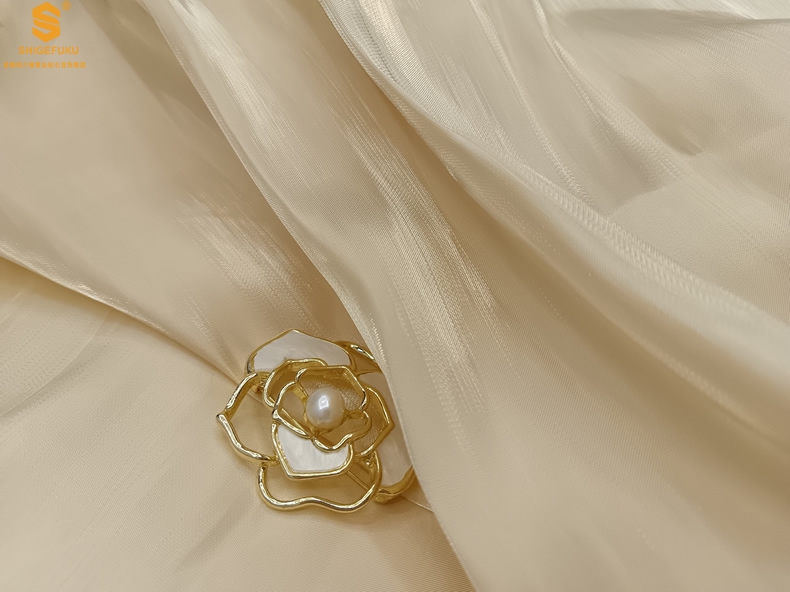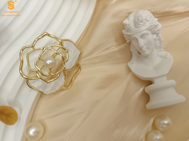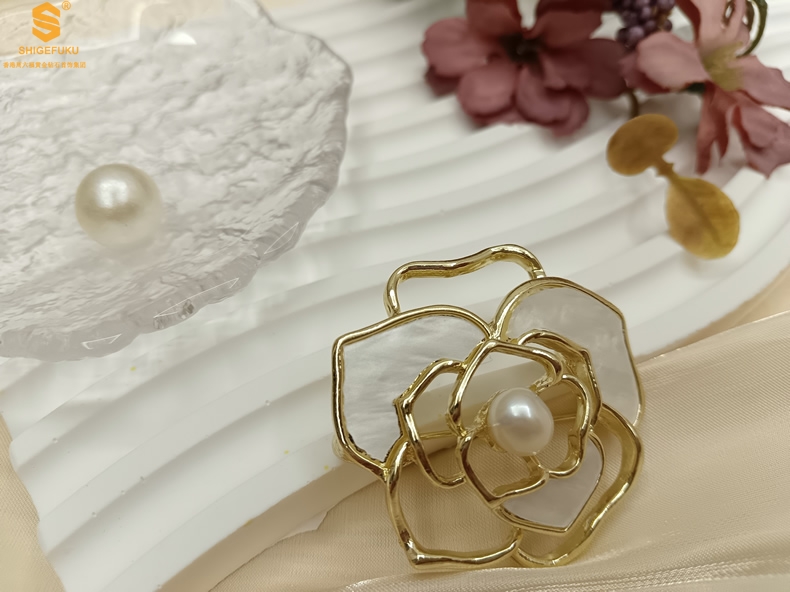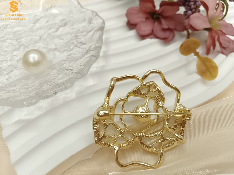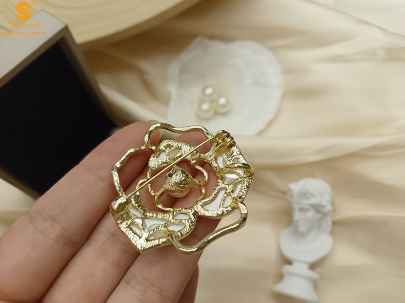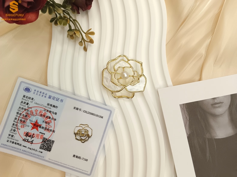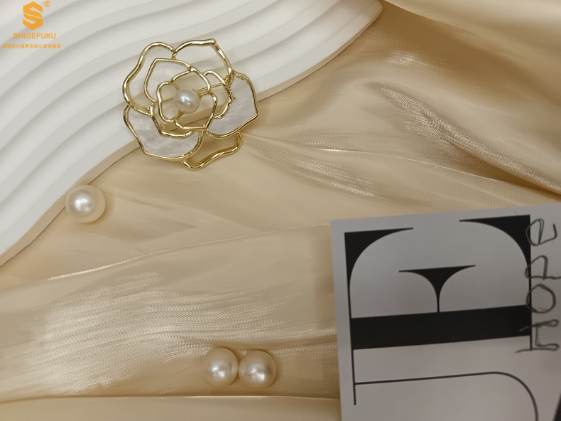 【品名】天然珍珠白贝山茶花胸针