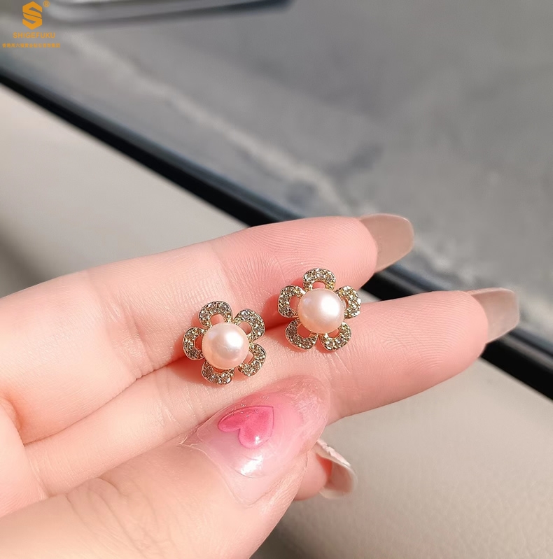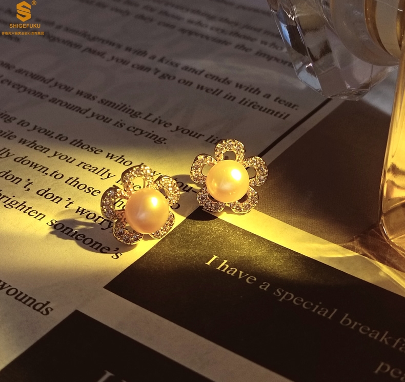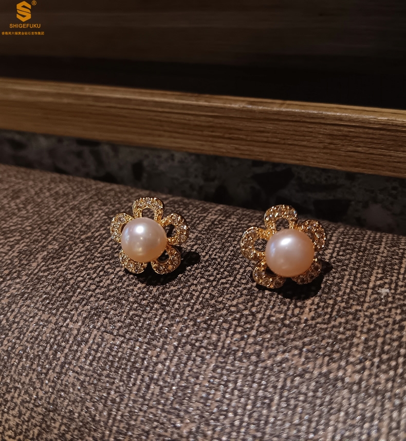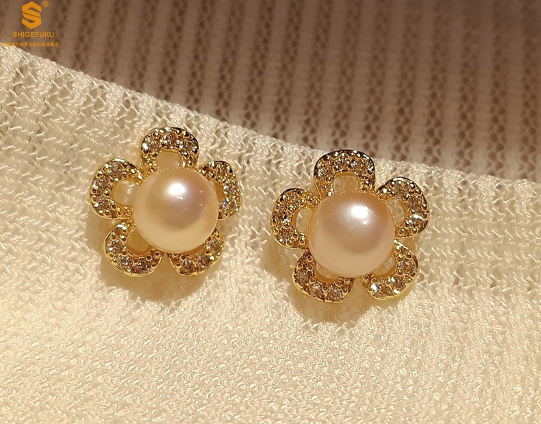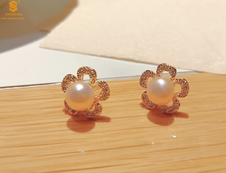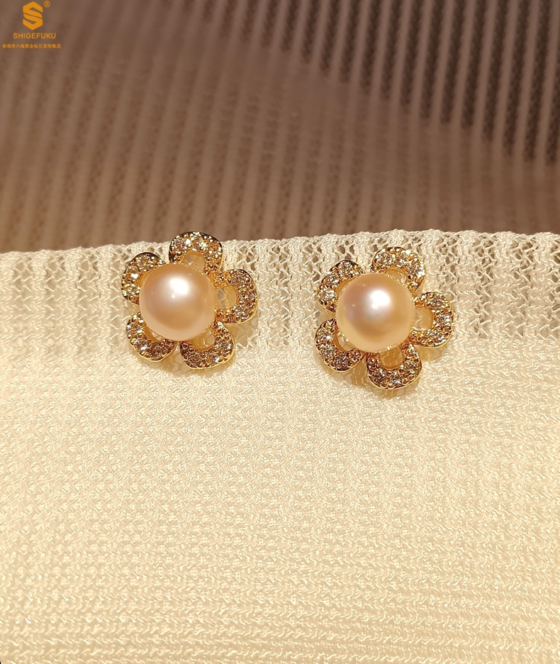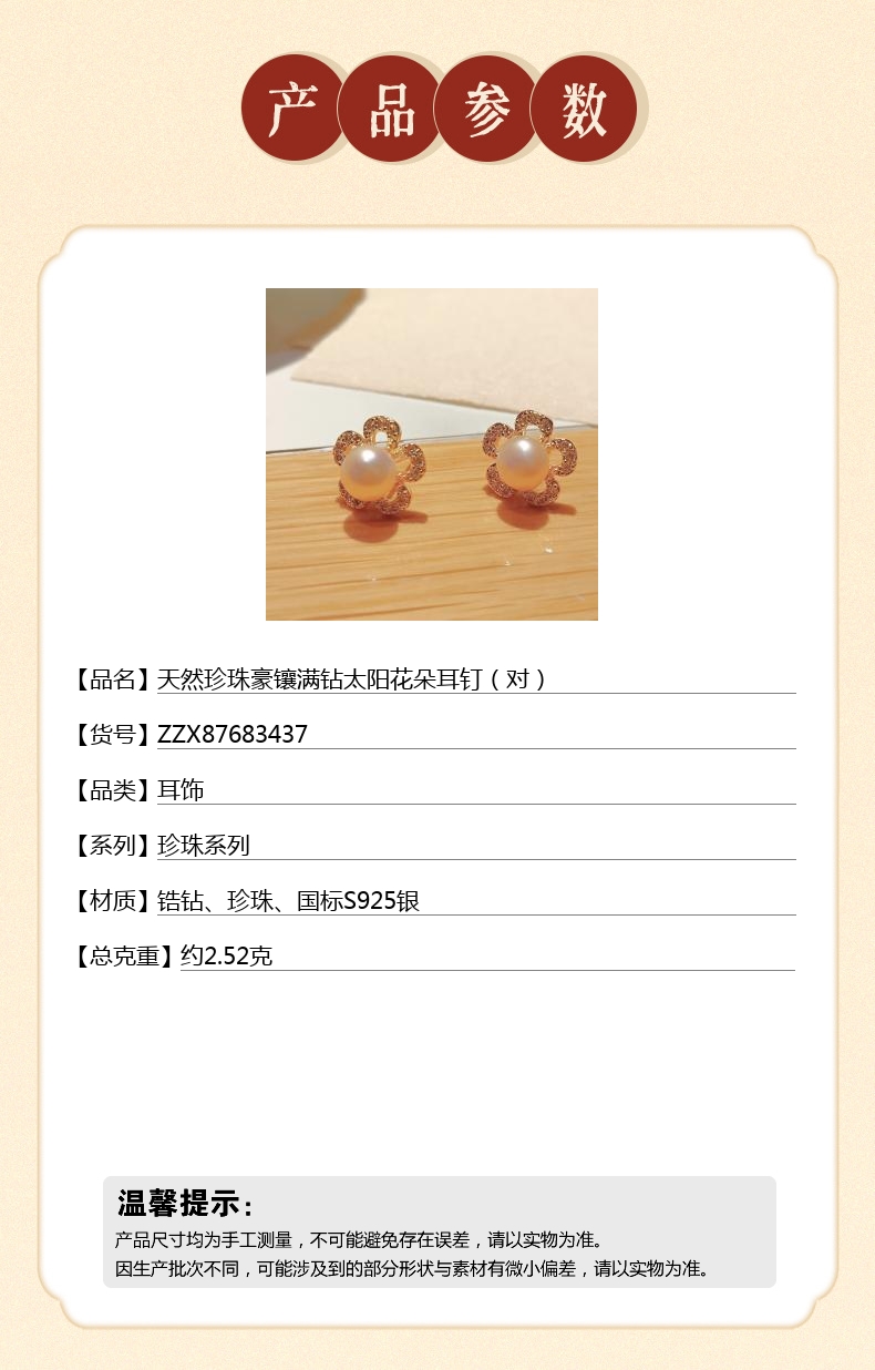 【品名】天然珍珠豪镶满钻太阳花朵耳钉(对)