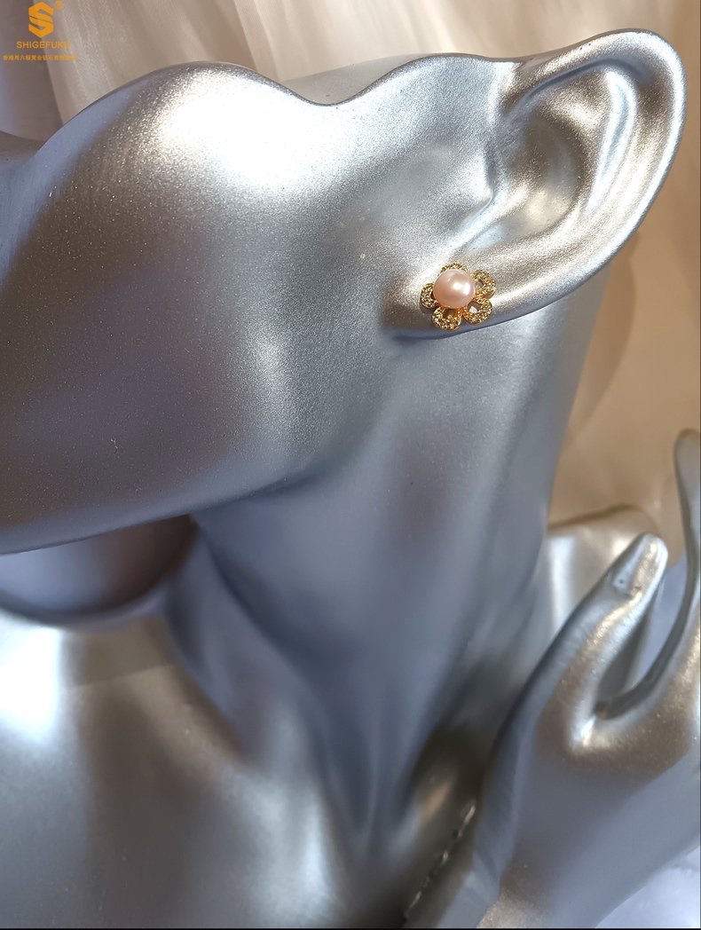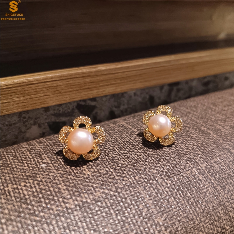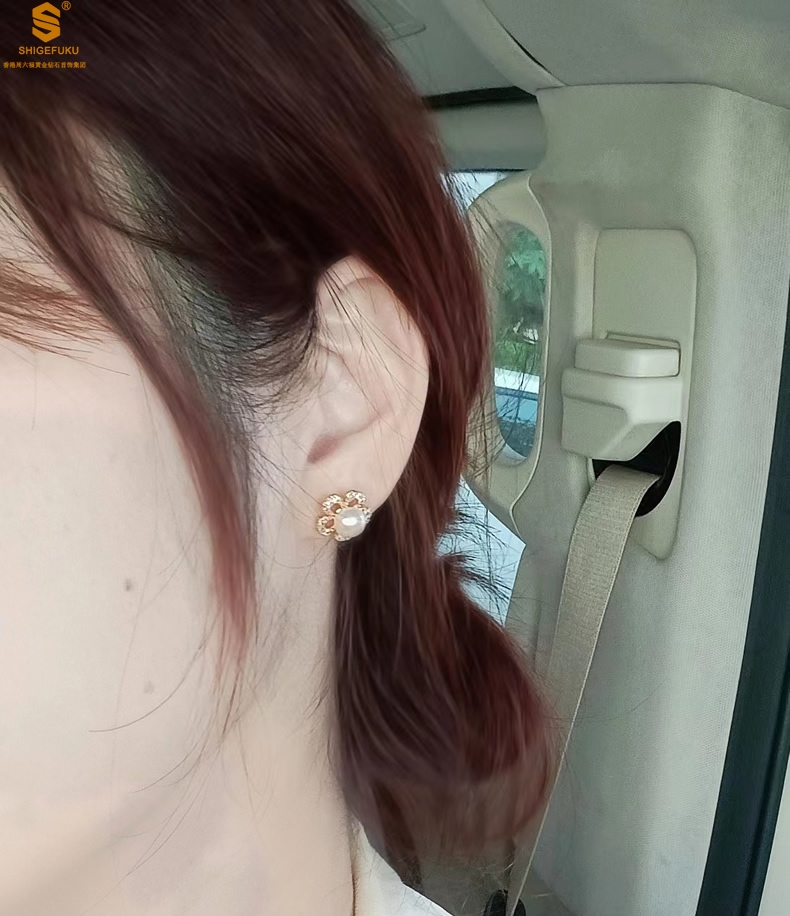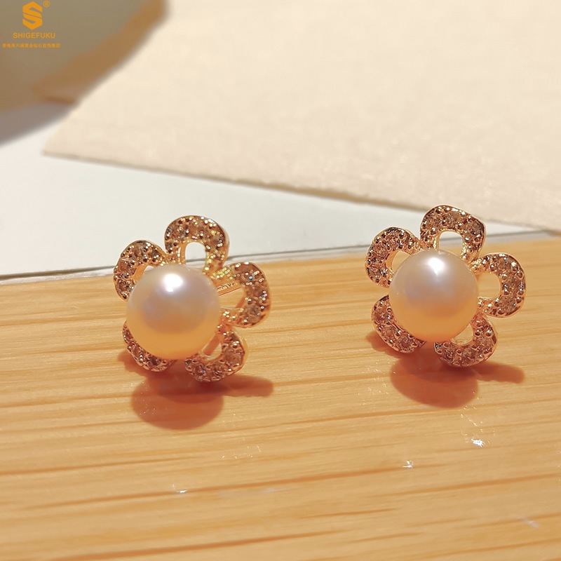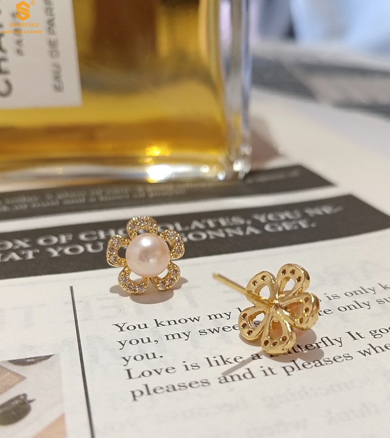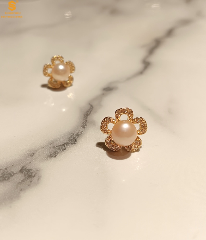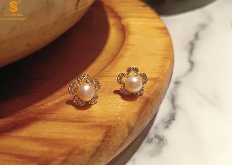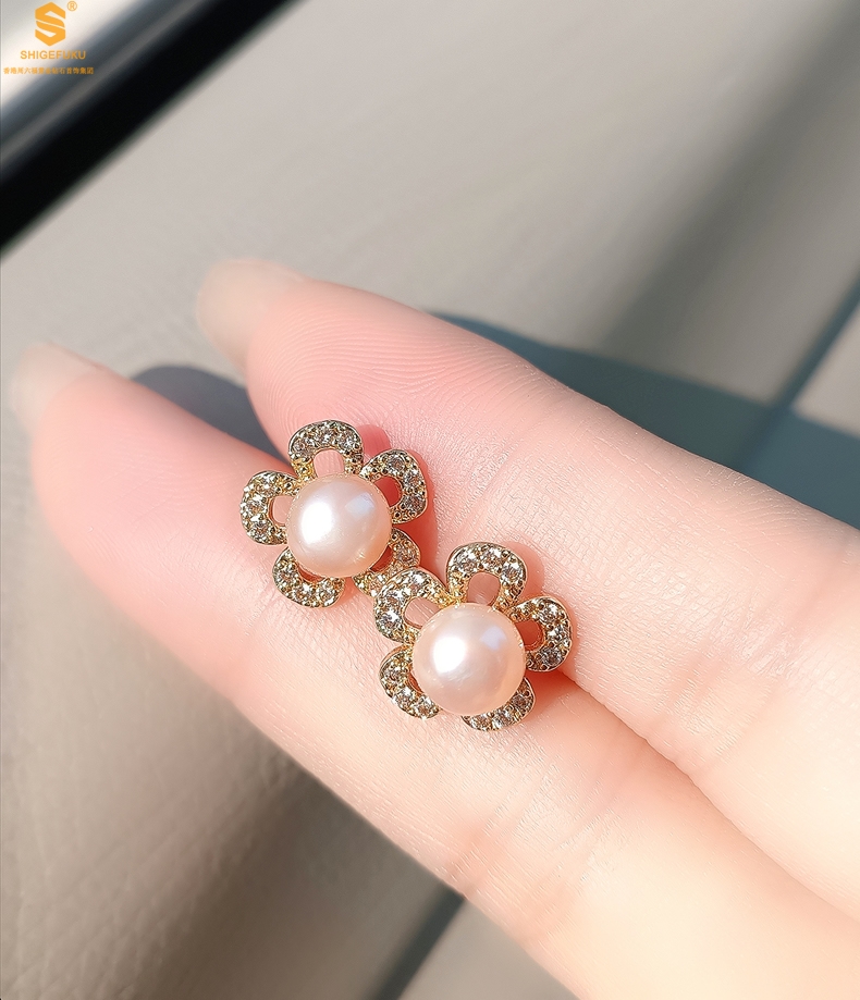 【品名】天然珍珠豪镶满钻太阳花朵耳钉(对)