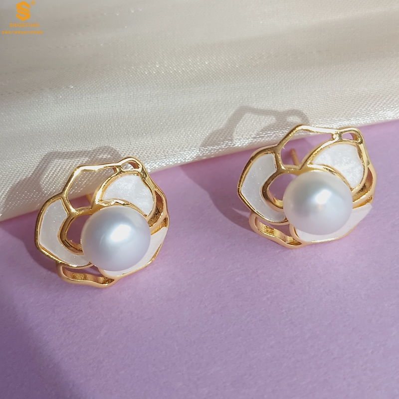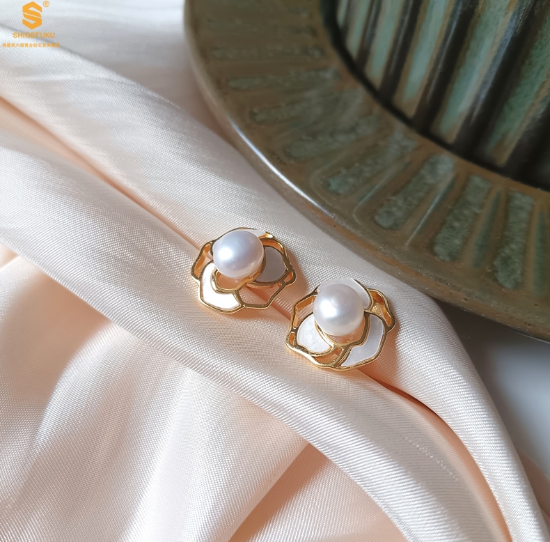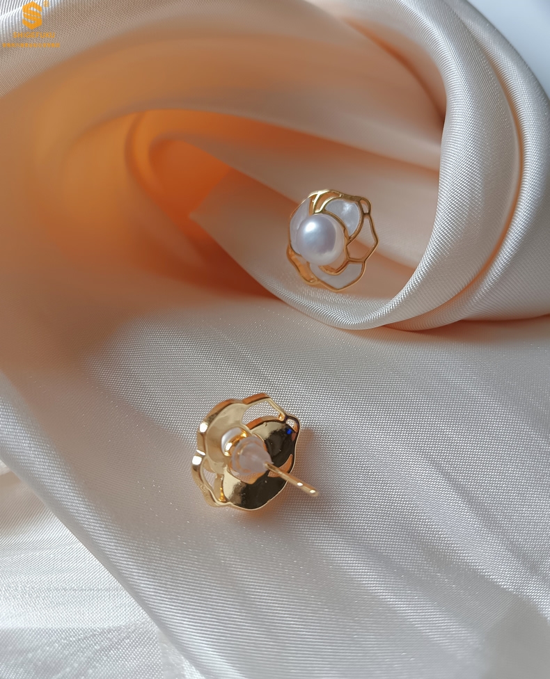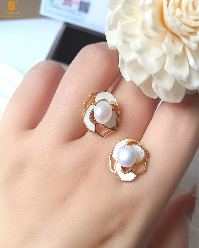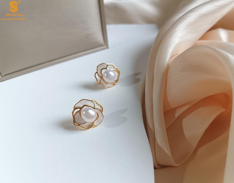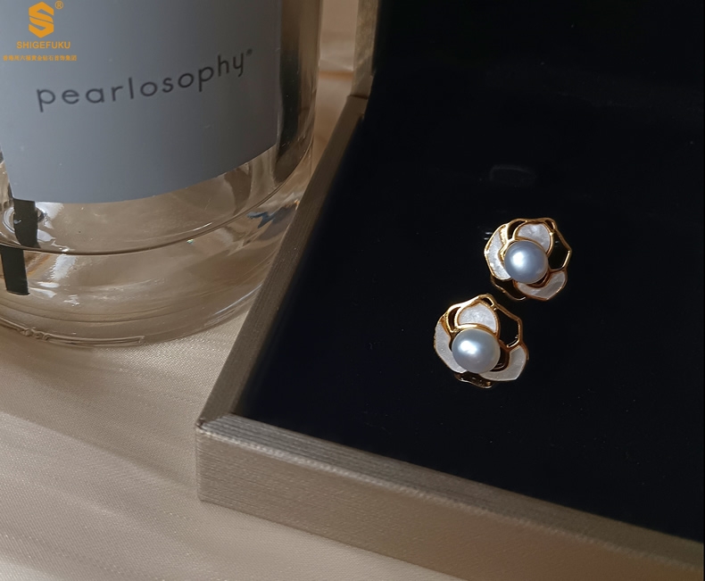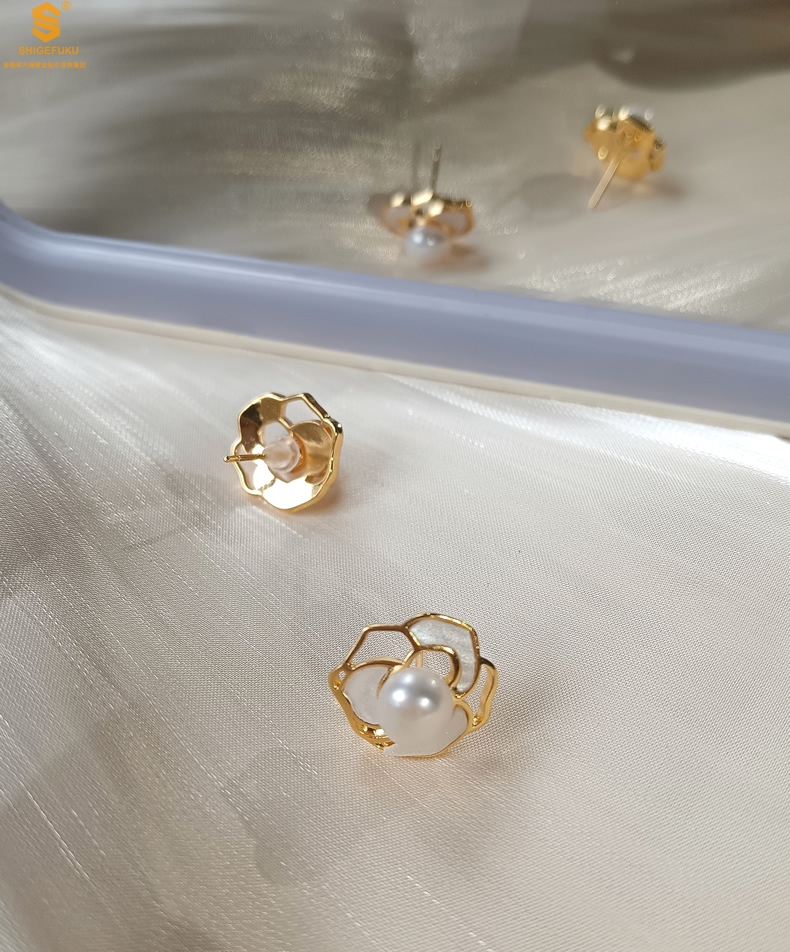 【品名】天然珍珠镶白母贝镂空山茶花耳钉(对)
