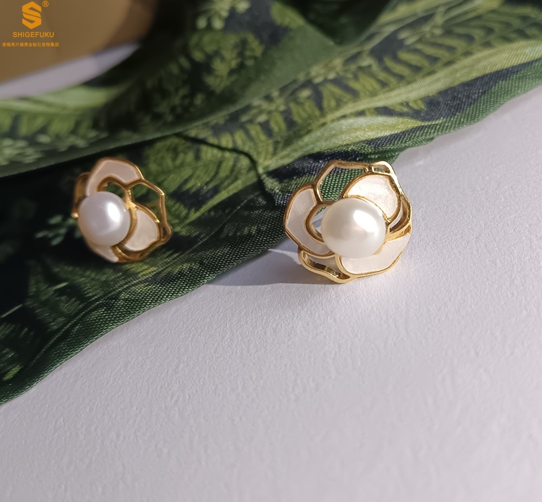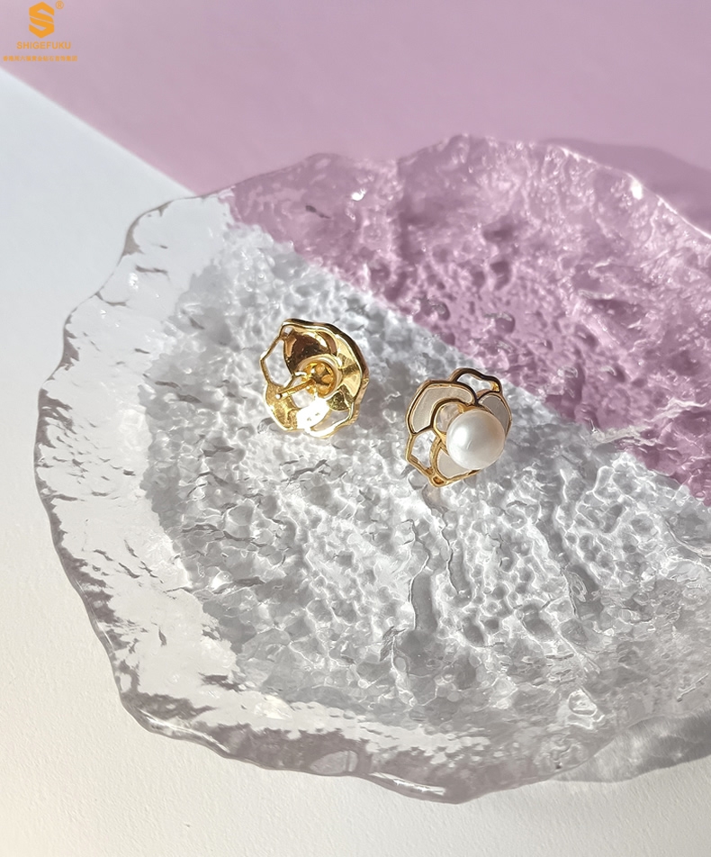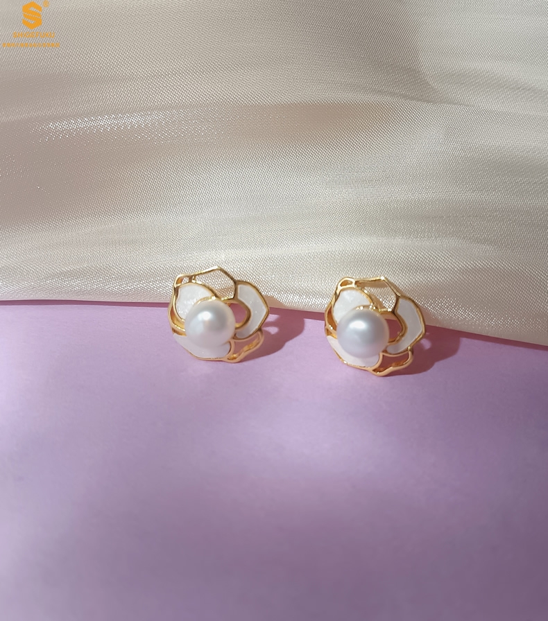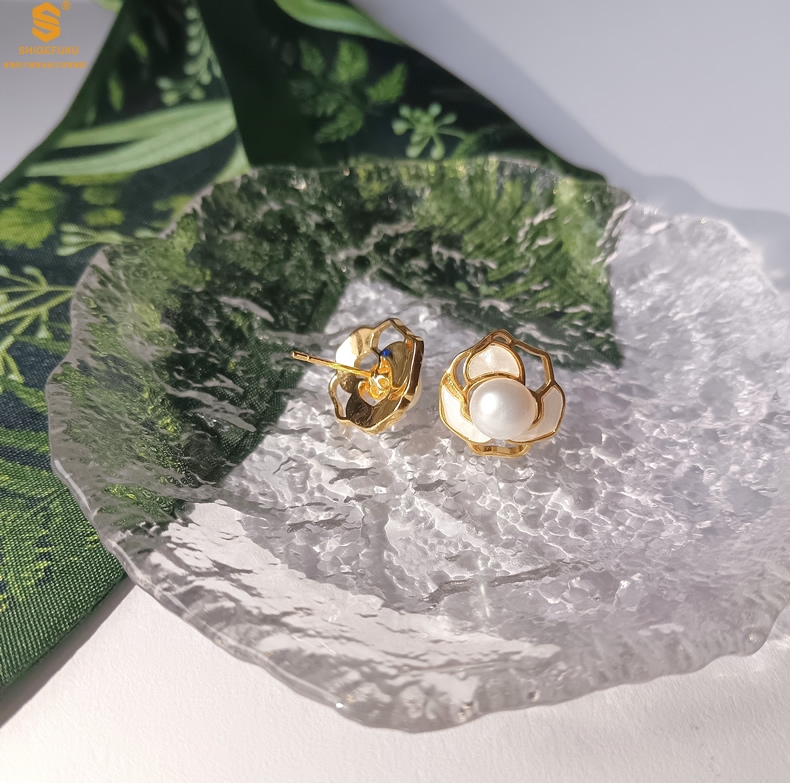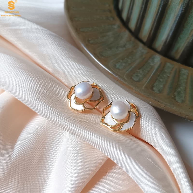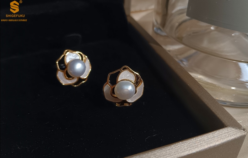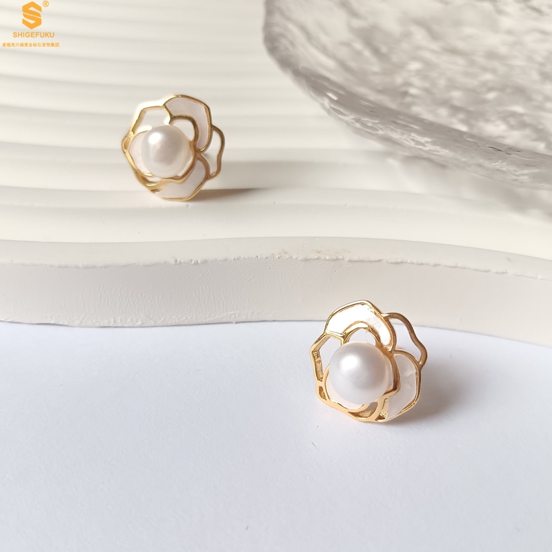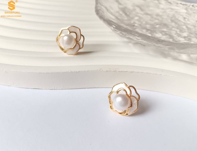 【品名】天然珍珠镶白母贝镂空山茶花耳钉(对)