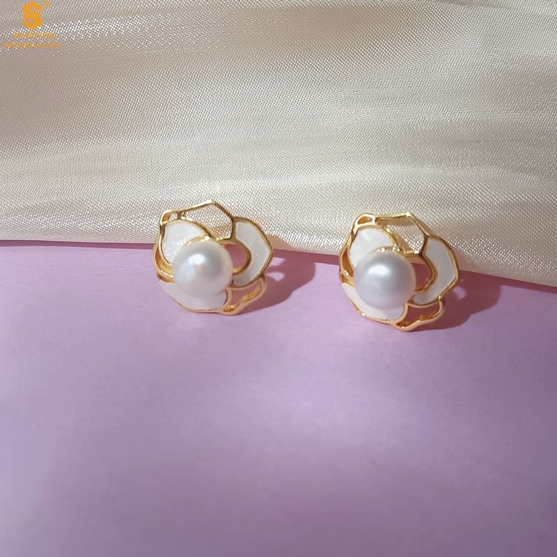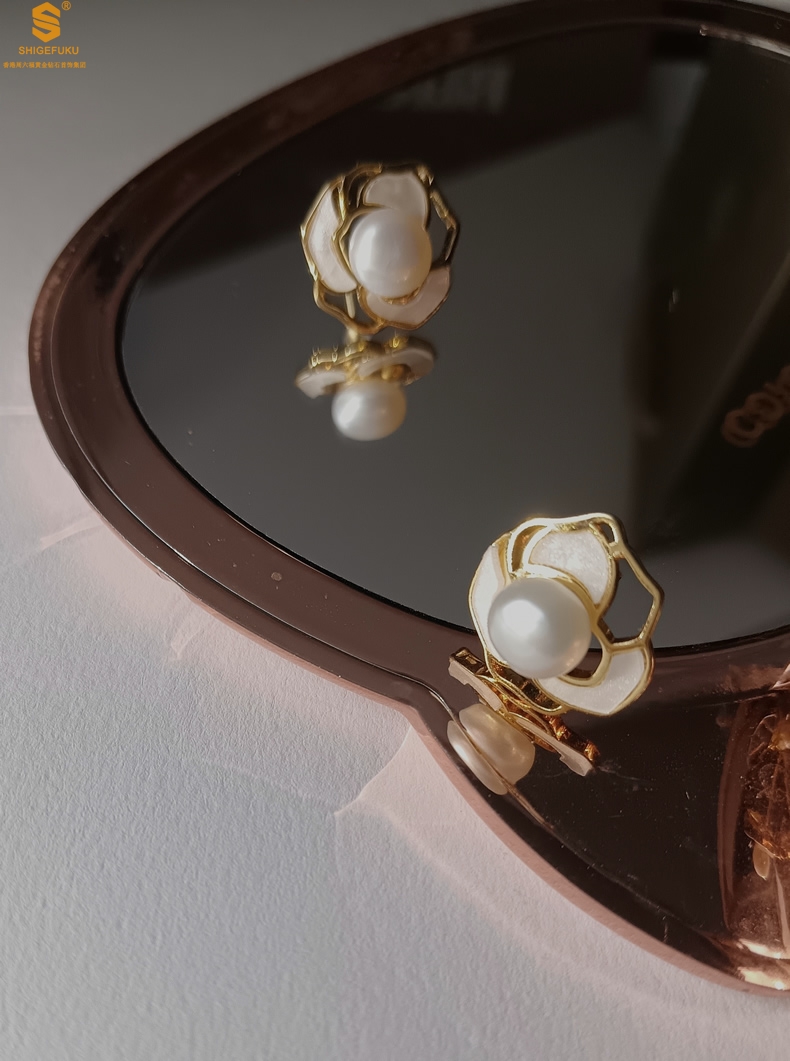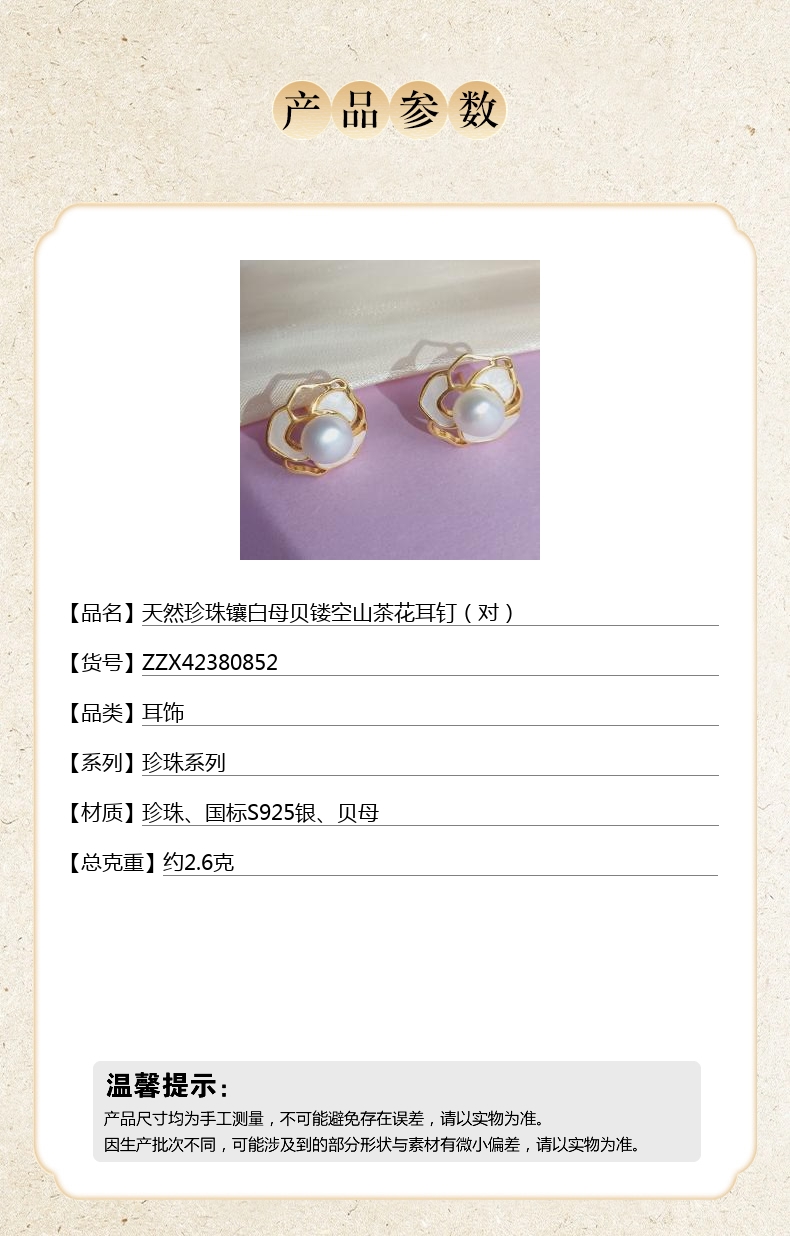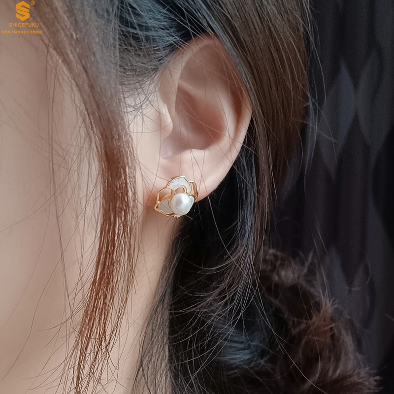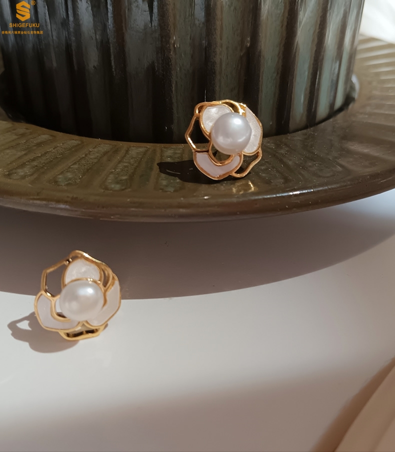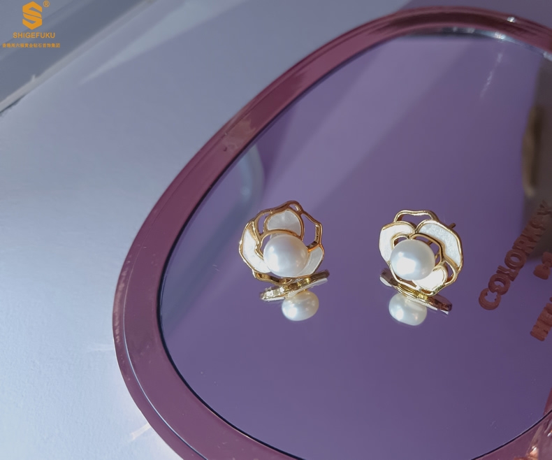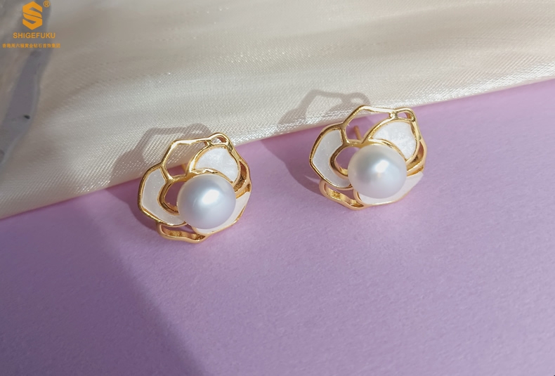 【品名】天然珍珠镶白母贝镂空山茶花耳钉(对)