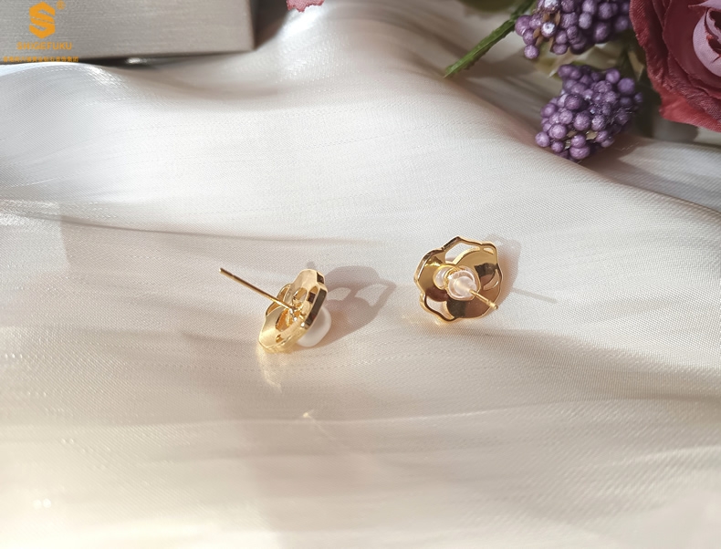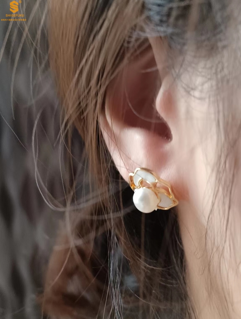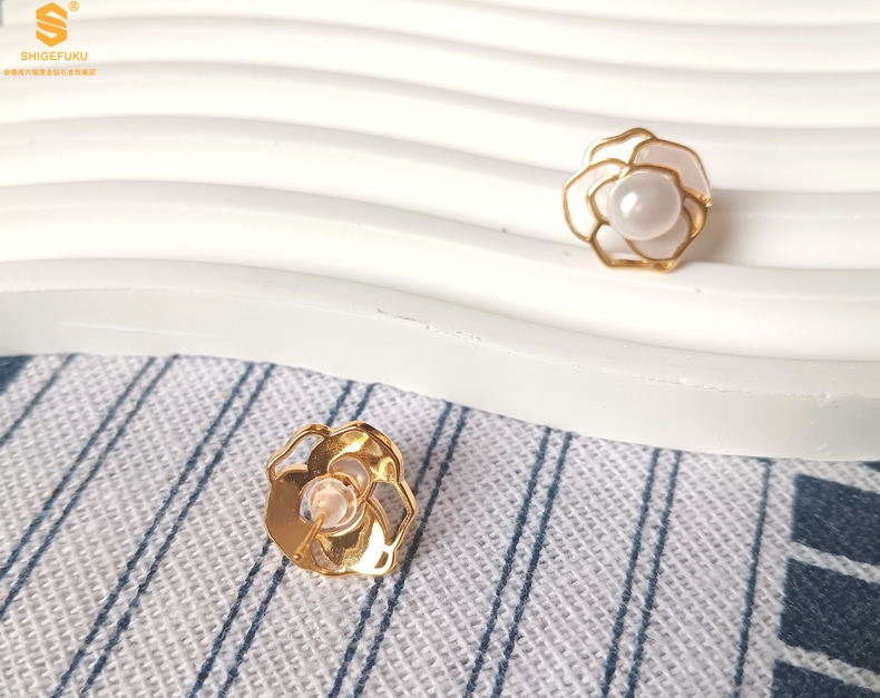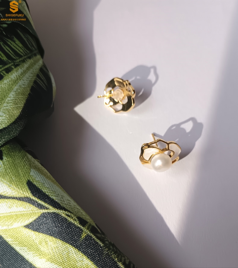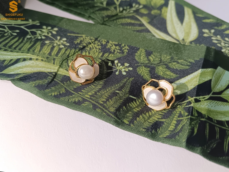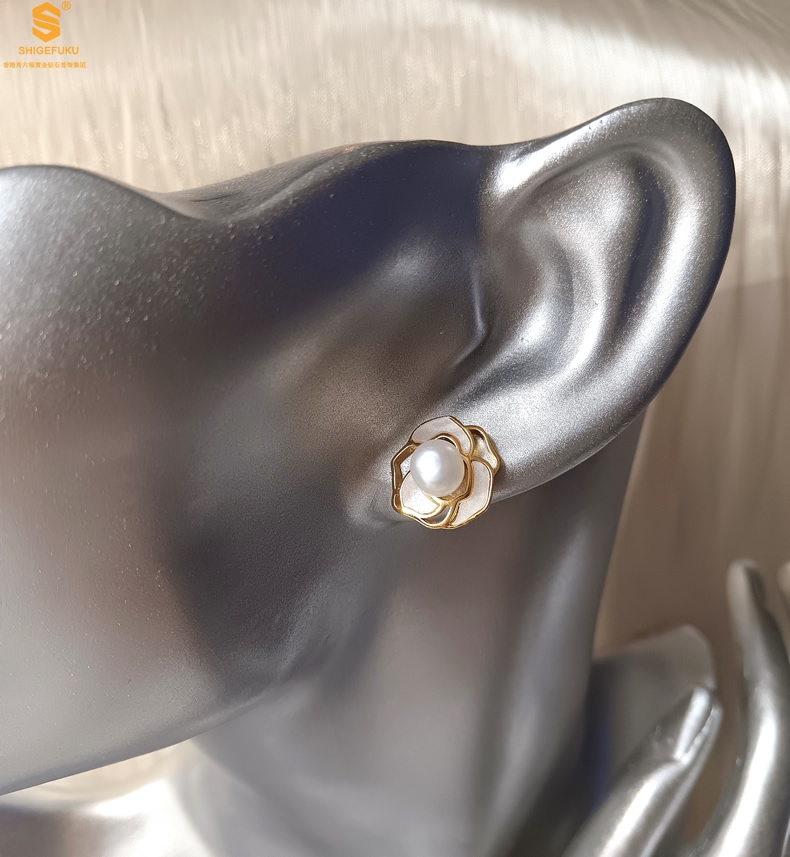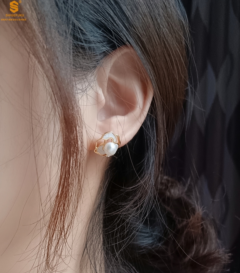 【品名】天然珍珠镶白母贝镂空山茶花耳钉(对)