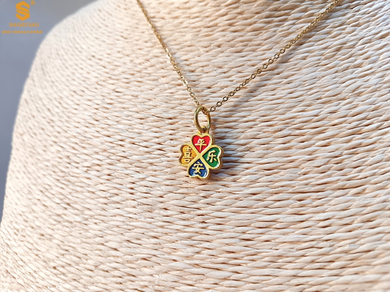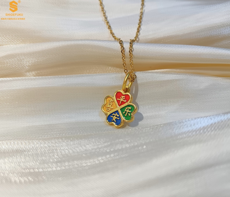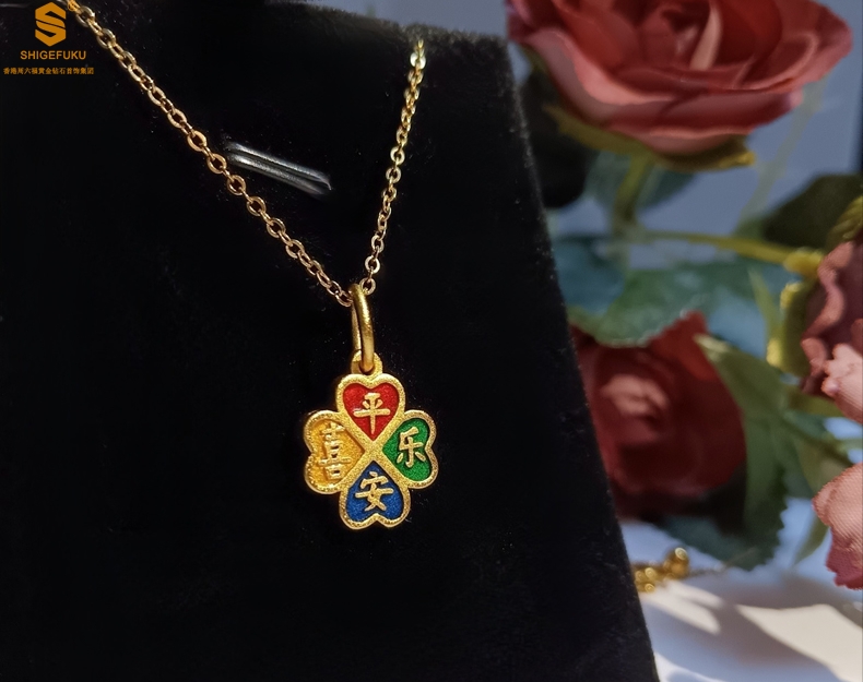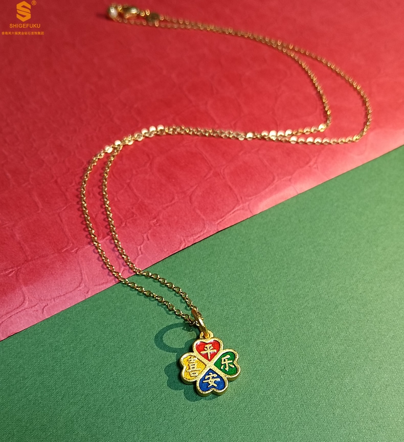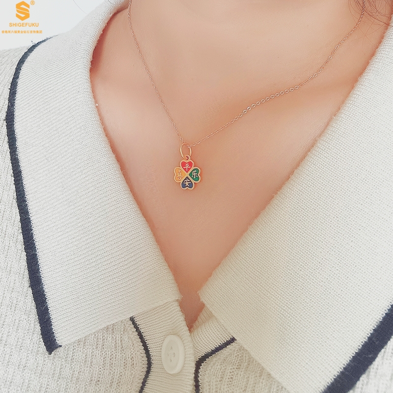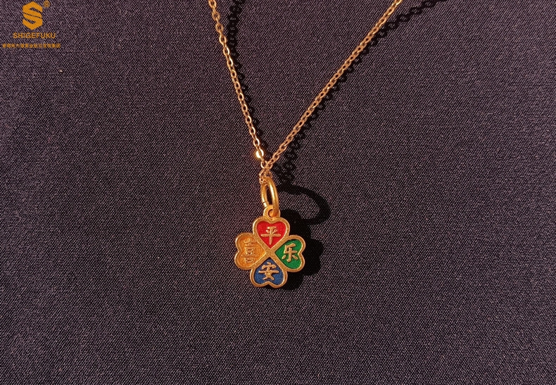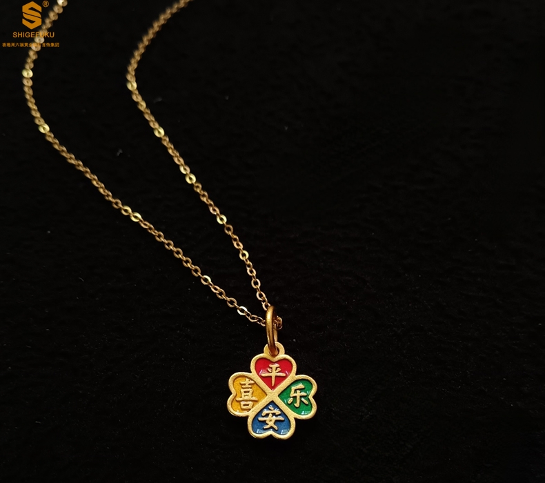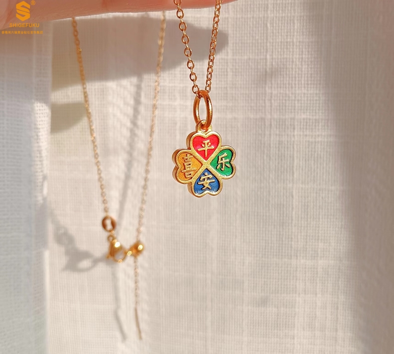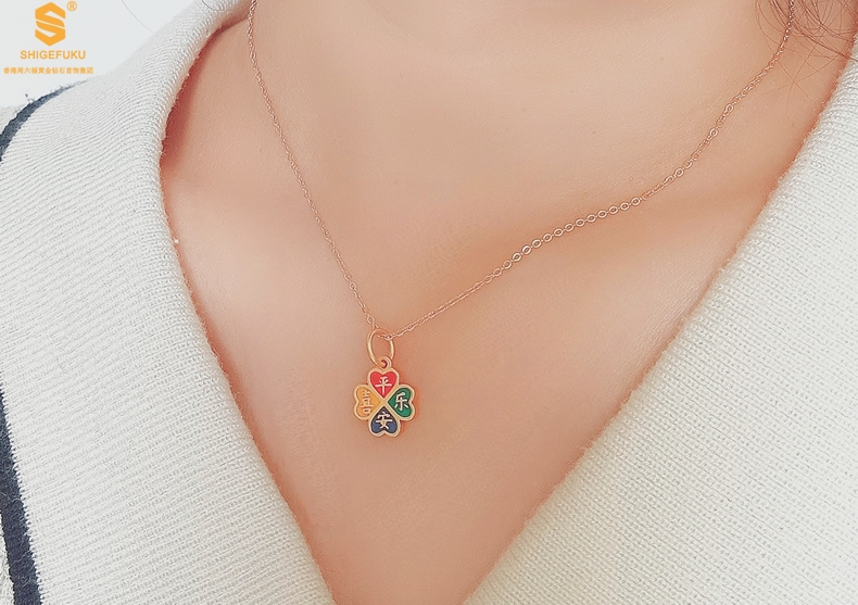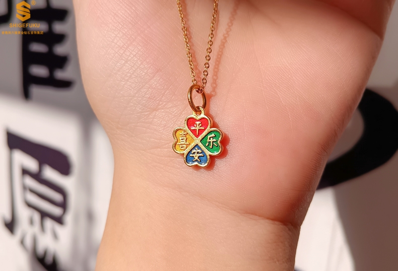 【品名】K金珐琅手绘平安喜乐四叶草吊坠(附赠K金项链)