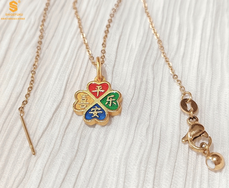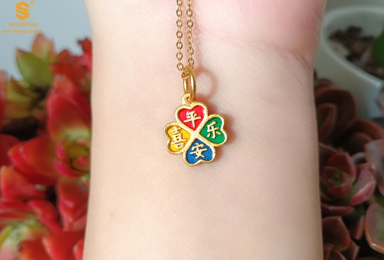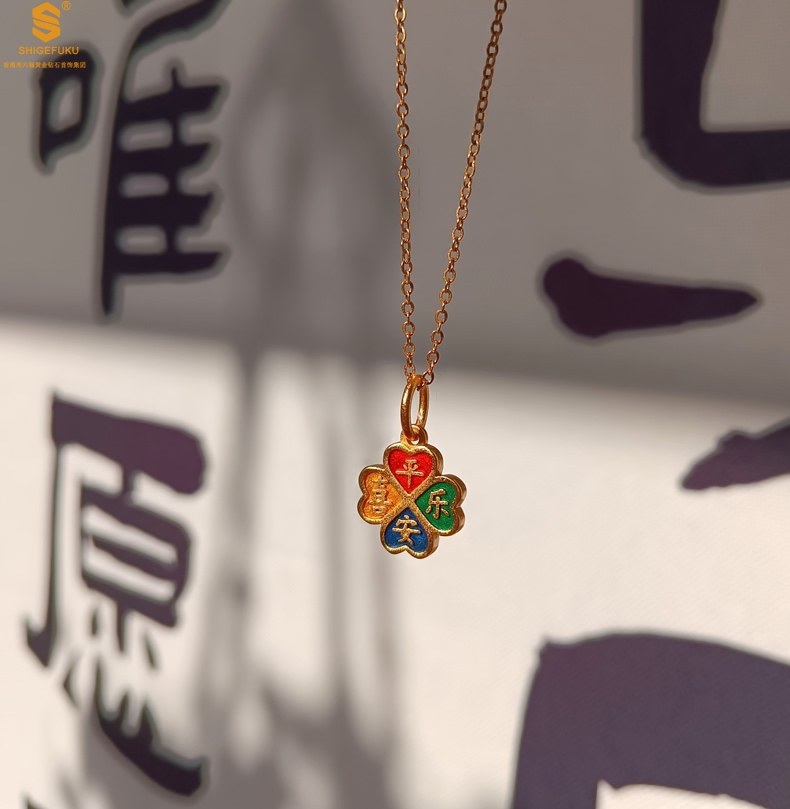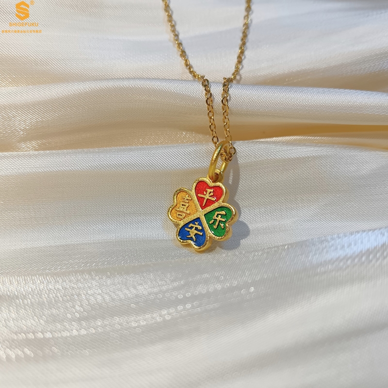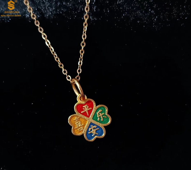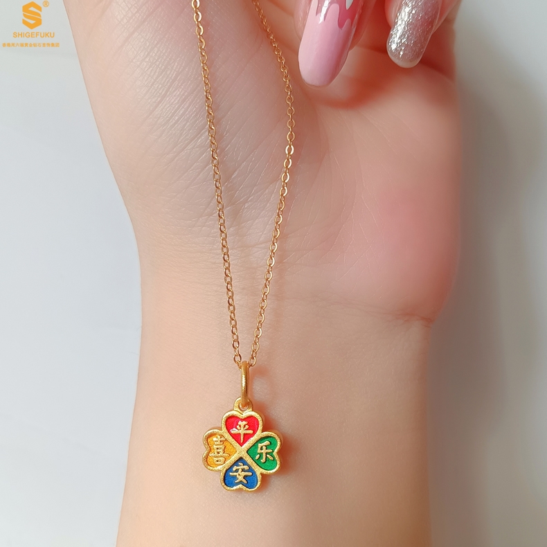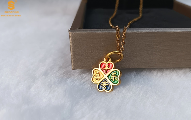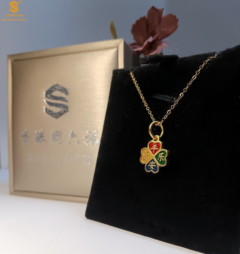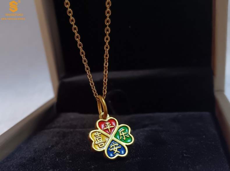 【品名】K金珐琅手绘平安喜乐四叶草吊坠(附赠K金项链)