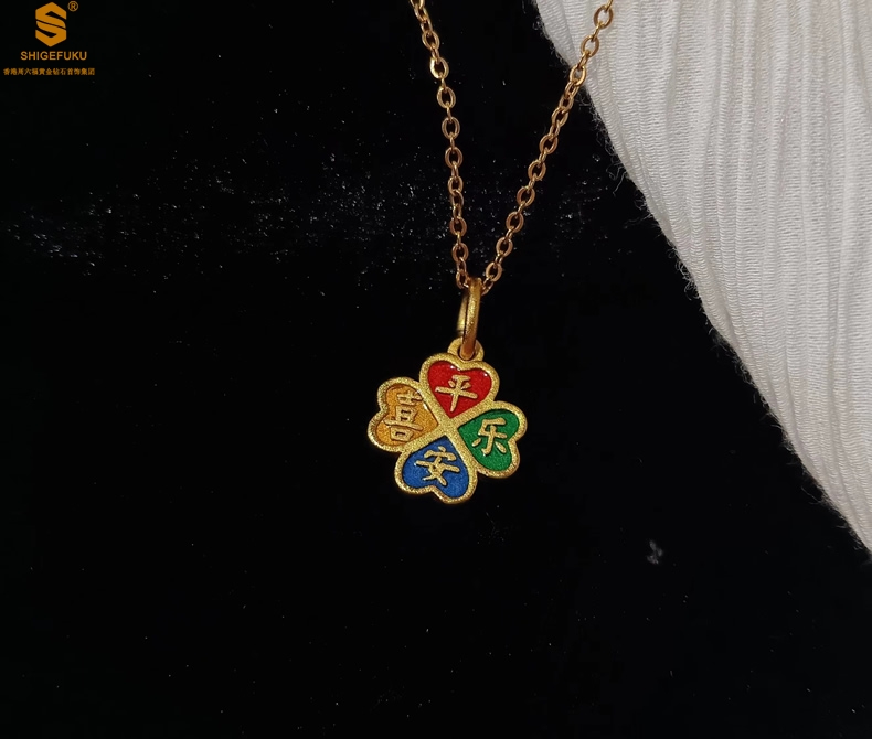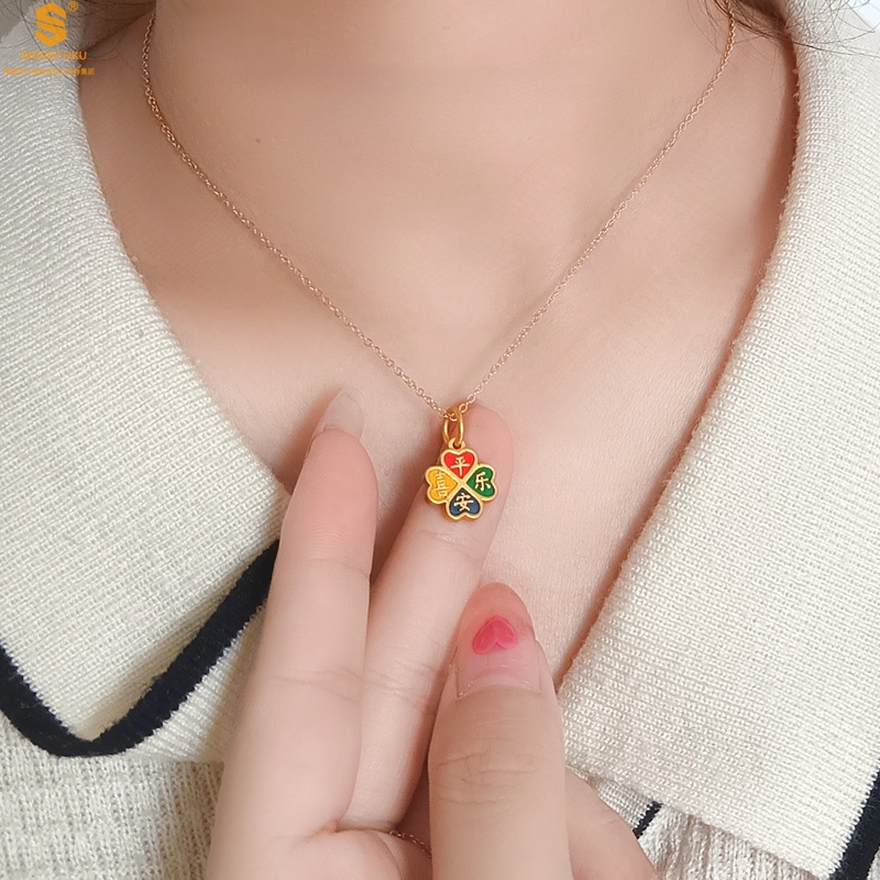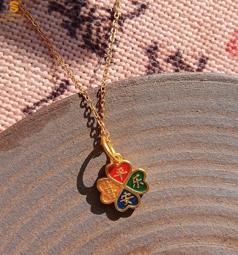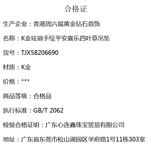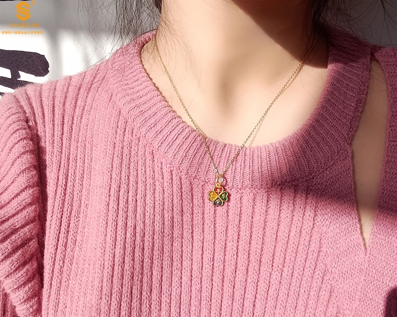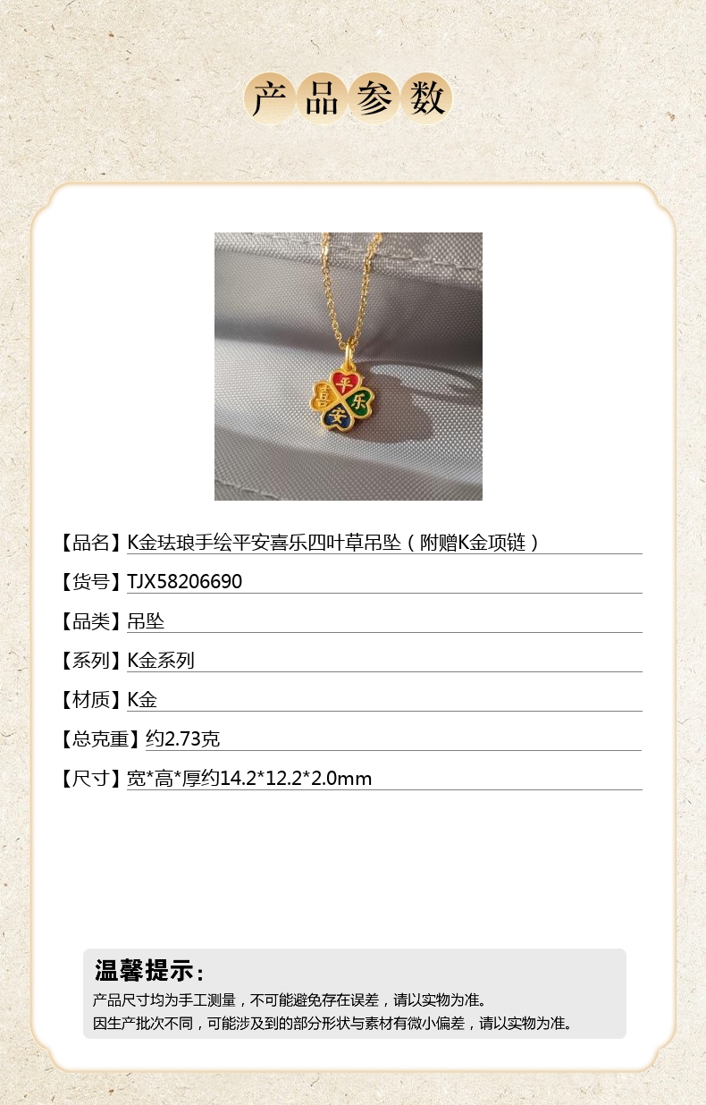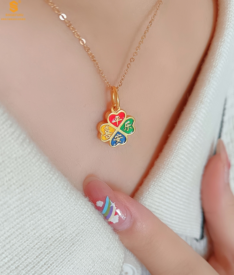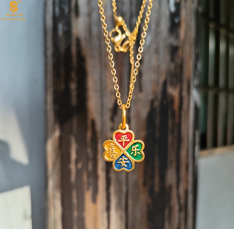 【品名】K金珐琅手绘平安喜乐四叶草吊坠(附赠K金项链)
