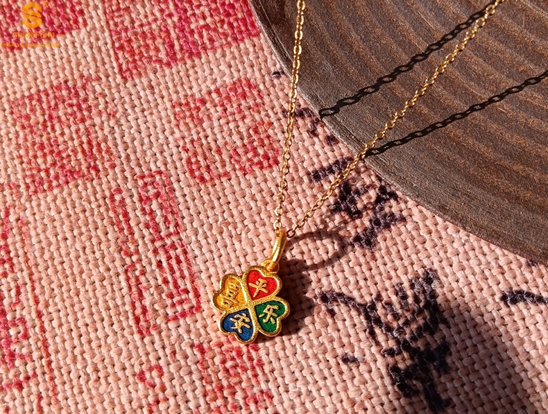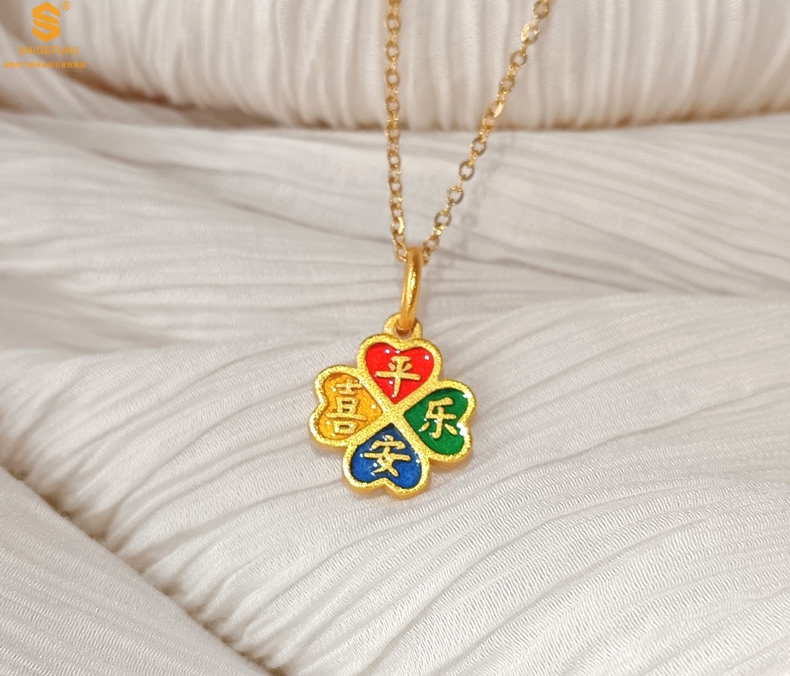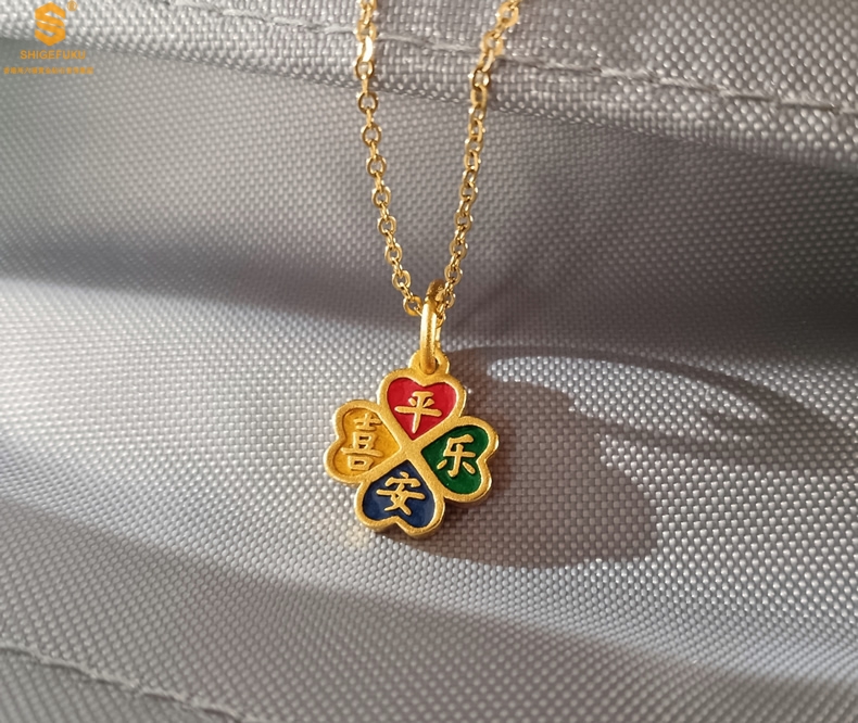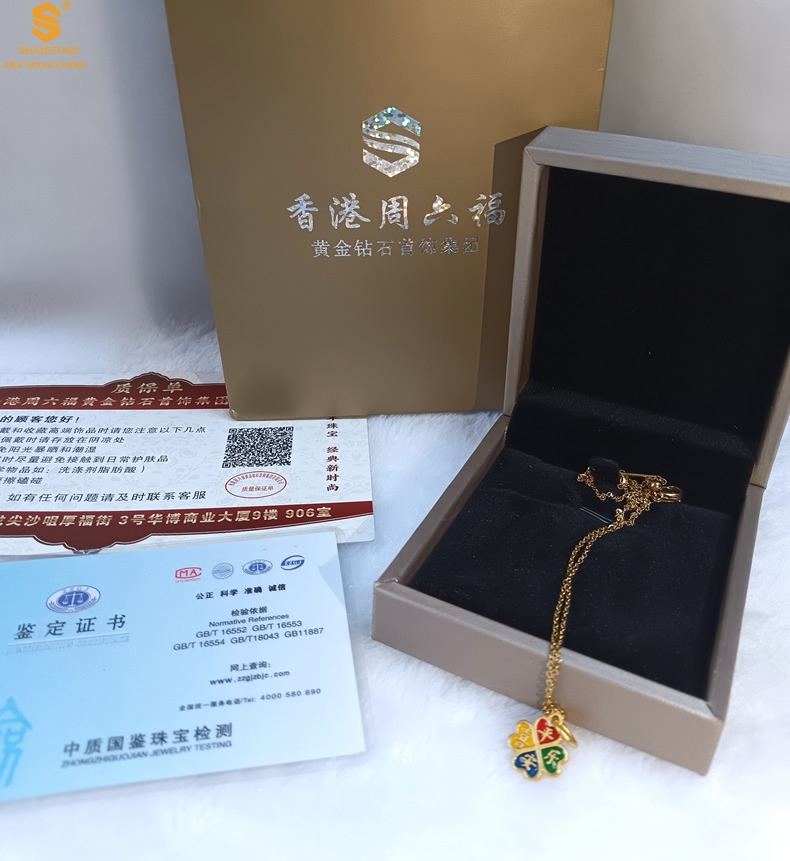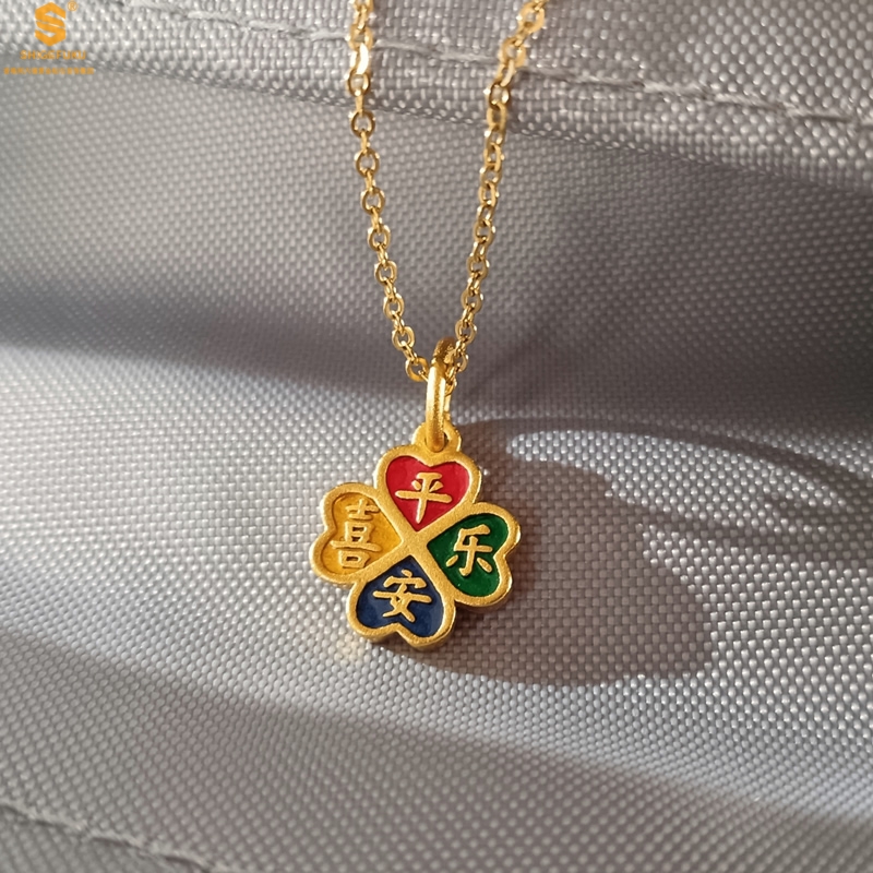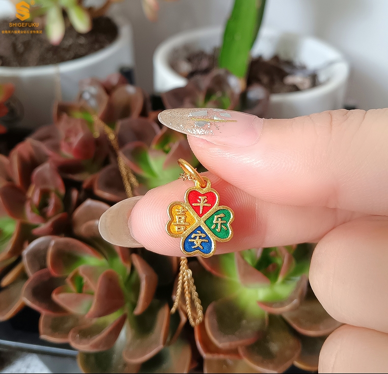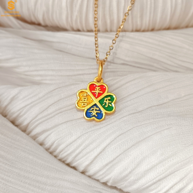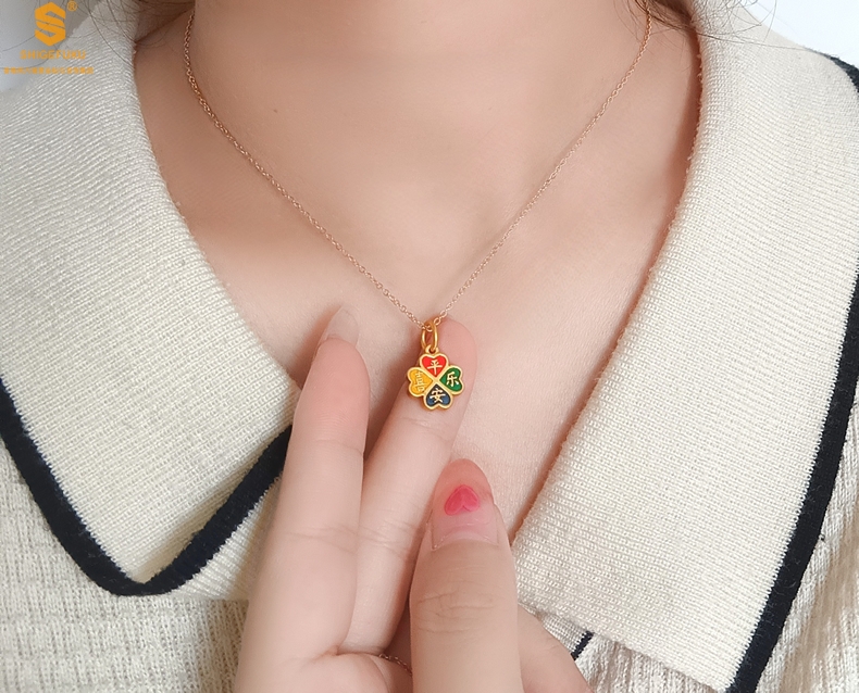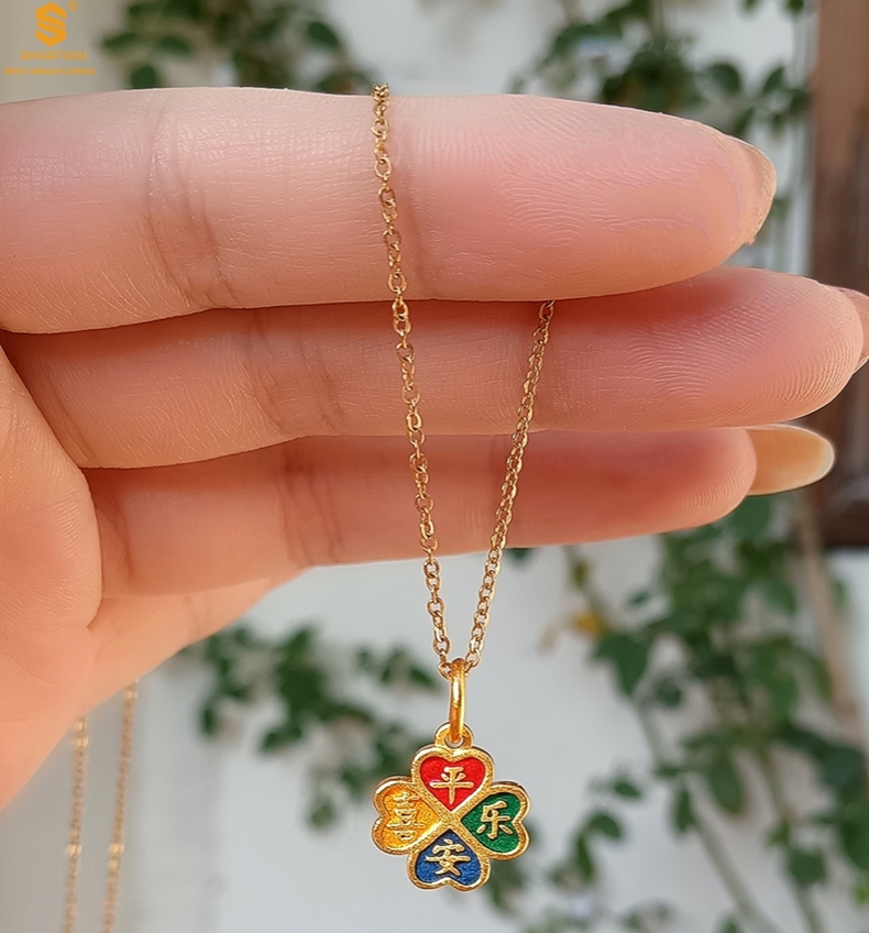 【品名】K金珐琅手绘平安喜乐四叶草吊坠(附赠K金项链)