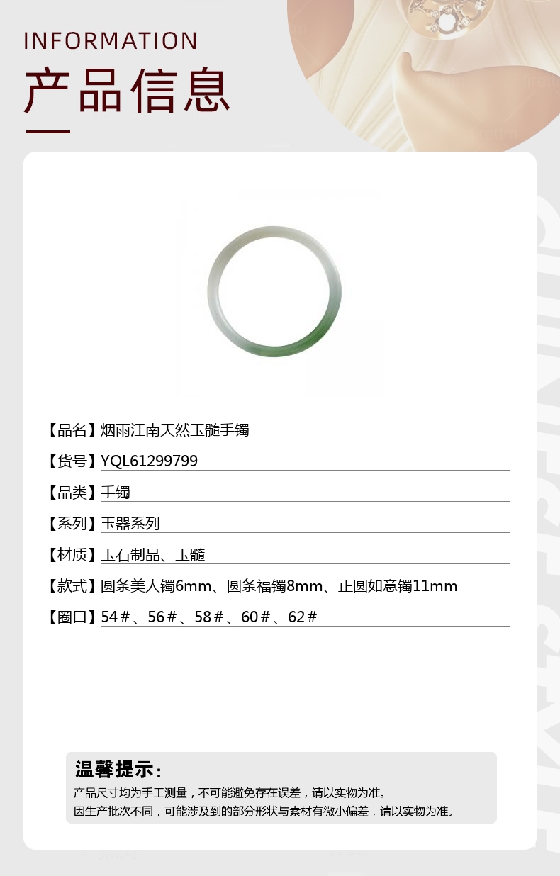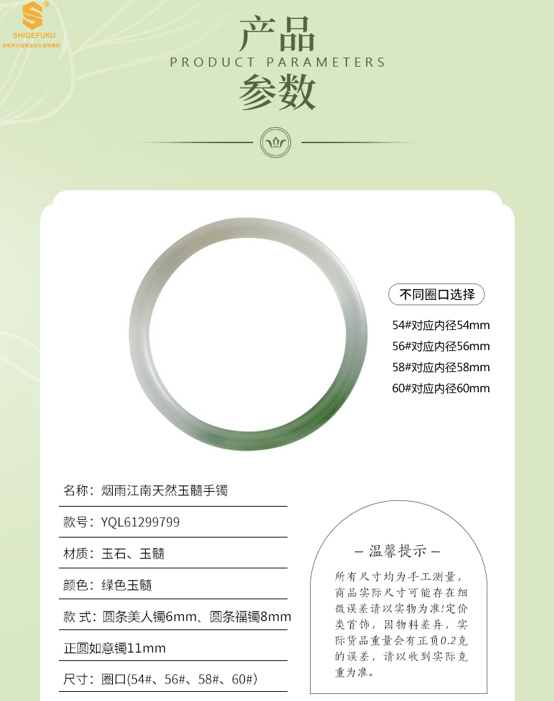 款式:圆条美人镯6mm、圆条福镯8mm、正圆如意镯11mm