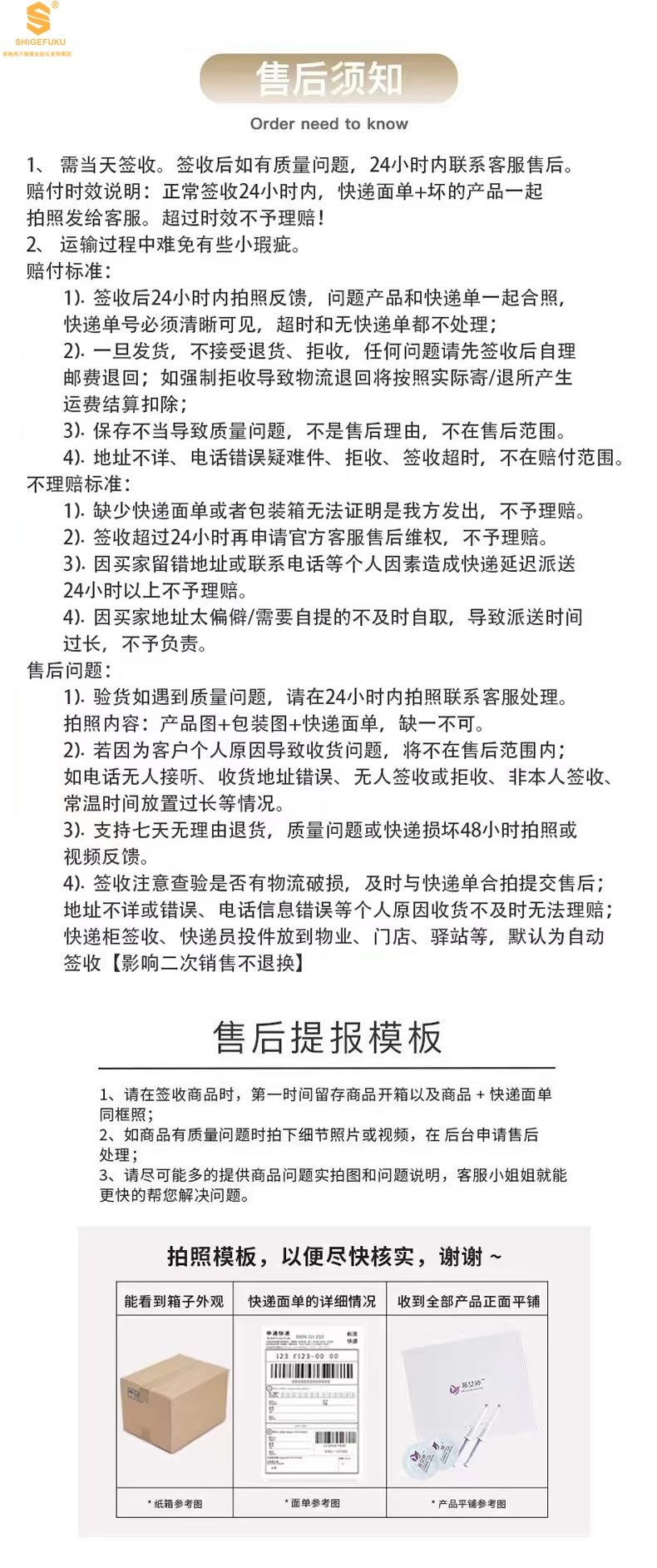1、当场签收后如有【错发、漏发】问题,应提供【快递面单+包装盒+所收物品全部】全部拍照传与我方客服负责核对。