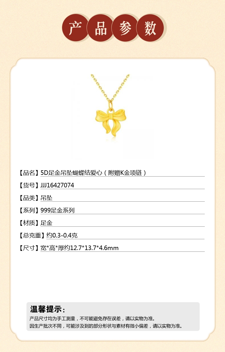 【品名】5D足金吊坠蝴蝶结爱心(附赠K金项链)